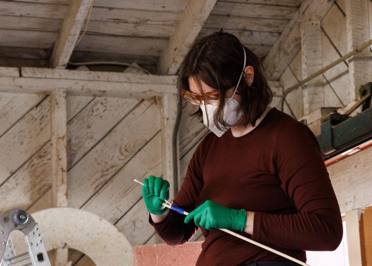 Outside the workshop, Mund dons a yellow poncho and a fresh pair of green lab gloves. She heads up the ladder to one of the three bat boxes fixed to the side of a red building. For the past few years, the team has been using a modified bike pump to apply a mix of clay and probiotics to the bat boxes. It works, but it's messy: hence the poncho.