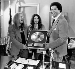 Lynyrd Skynyrd through the years Lynyrd Skynyrd members Ronnie Van Zant and Gary Rossington present a Gold Album to Atlanta Mayor Maynard Jackson (Photo by Tom Hill/WireImage) (Tom Hill)
