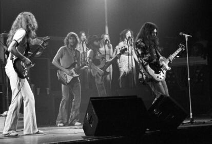 Lynyrd Skynyrd through the years ATLANTA, GA - July 10: Guitarist Allen Collins, guitarist Steve Gaines, bassist Leon Wilkeson, The Honkettes and guitaraist Gary Rossington of Lynyrd Skynyrd perform at the Fabulous Fox Theater on July 10, 1976 in Atlanta, Georgia. (Photo by Tom Hill/WireImage) (Tom Hill)