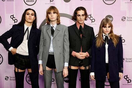 2022 American Music Awards - Arrivals LOS ANGELES, CALIFORNIA - NOVEMBER 20: (EDITORIAL USE ONLY) (L-R) Ethan Torchio, Thomas Raggi, Damiano David and Victoria De Angelis of Måneskin attend the 2022 American Music Awards at Microsoft Theater on November 20, 2022 in Los Angeles, California. (Photo by Frazer Harrison/Getty Images) (Frazer Harrison/Getty Images)