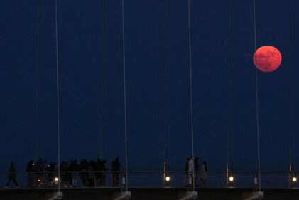 Views of the full strawberry moon from around the world TORONTO, CANADA - JUNE 21 : Full moon rises over Humber Bay Arch Bridge in Toronto, Ontario on June 21, 2024. (Photo by Mert Alper Dervis/Anadolu via Getty Images) (Anadolu/Anadolu via Getty Images)