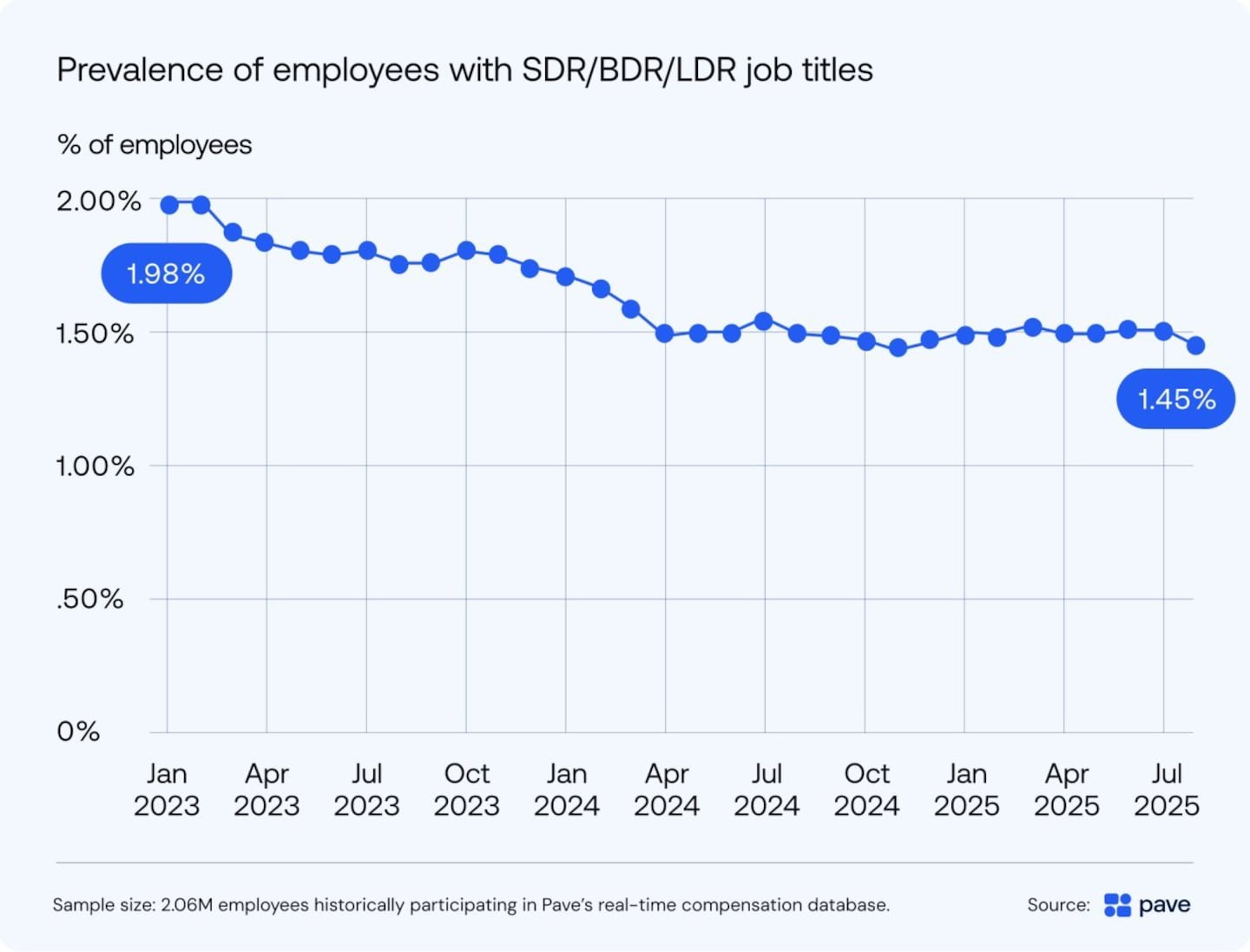 Historically, SDR roles served as a gateway for new college graduates into lucrative sales positions. If you proved yourself as an SDR by making thousands of cold calls and learning the basics of selling, you could advance. However, when Pave examined the prevalence of employees with SDR-related job titles, the data shows these jobs are steadily disappearing.
