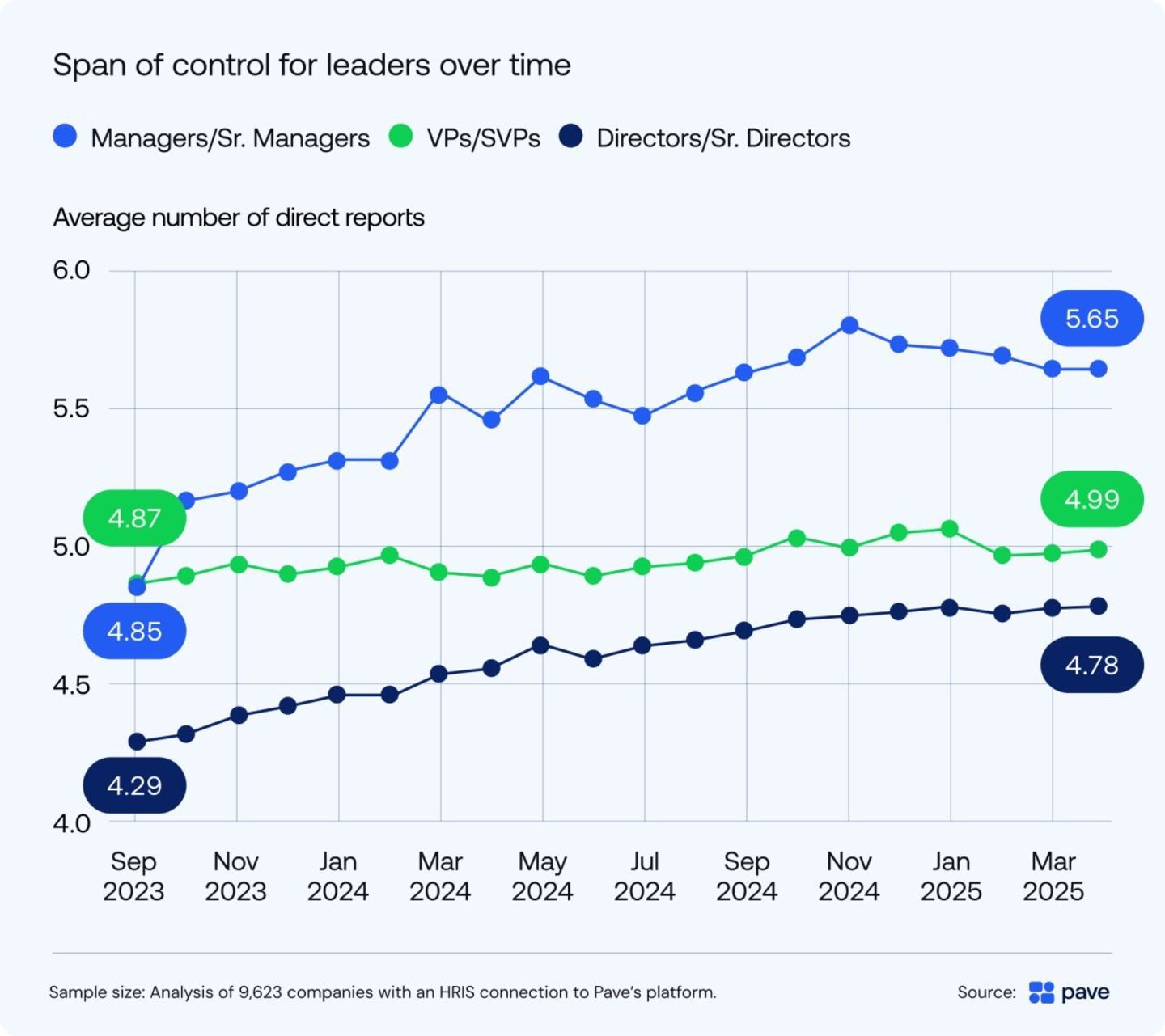 As the chart below illustrates, between September 2023 and April 2025, the average span of control for managers and senior managers grew from 4.85 to 5.65 direct reports, a 16.6% increase. Over the same period, the average span of control for directors and senior directors grew from 4.30 to 4.79 direct reports, an 11.4% increase. For vice presidents and senior vice presidents, the average span of control grew from 4.87 to 4.99 direct reports, a 2.5% increase.