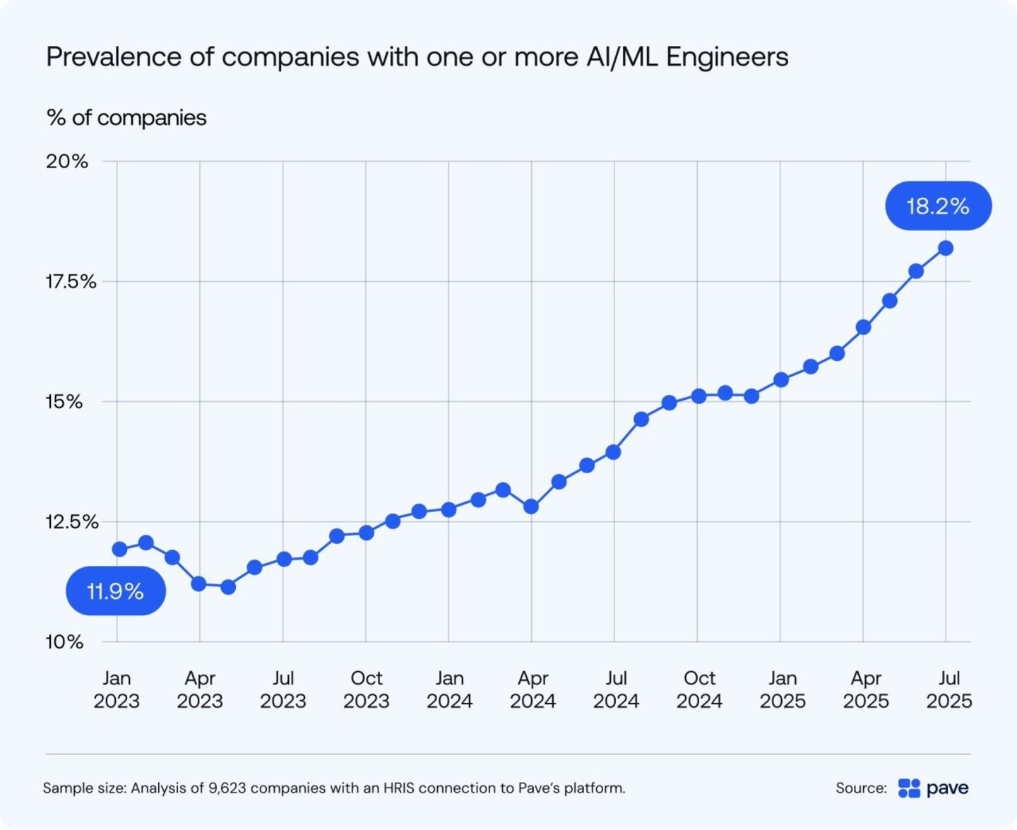 The rate of growth for Go-To-Market (GTM) Engineers is even faster. This so-called “hot job” is taking off as companies work to incorporate AI applications into their sales and marketing technology ecosystems. Again, among all companies connected to Pave’s database, the prevalence of companies with at least one GTM Engineer grew from 0.02% in January 2023 to 0.51% in July 2025, with a clear spike occurring at the start of this year.