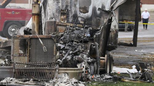Two people died, but the trucker managed to jump free before it exploded. The truck was hauling dog food from the nearby Purina plant.