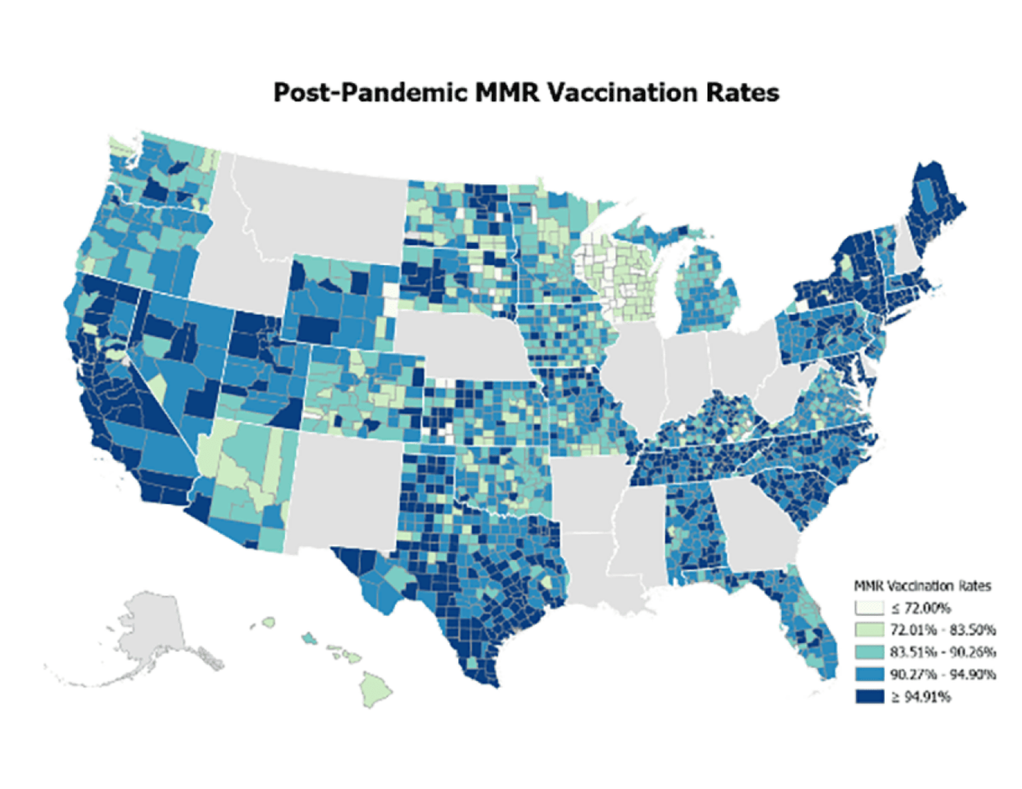Gardner, who also led the data collection efforts behind Johns Hopkins' COVID-19 dashboard, and her team collected county-level, two-dose MMR vaccine rates for kindergarteners from each state's department of health website from 2017 to 2024, where available. Ultimately, they were able to analyze trends in 2,066 counties across 33 states and made all their data available to download.