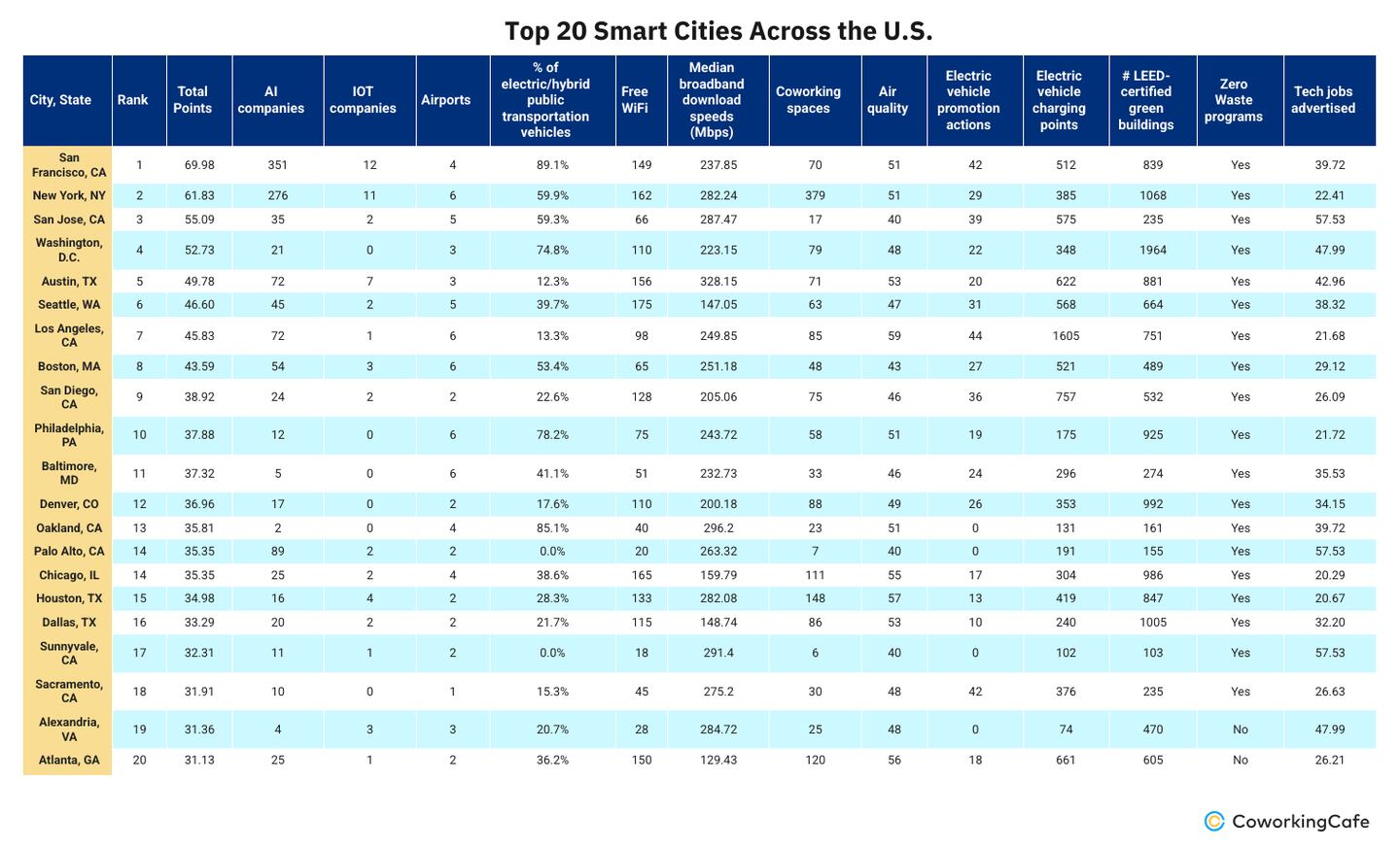 So which are 2025's top smart cities? To identify the U.S. cities making the biggest strides in technology-driven urban development, CoworkingCafe analyzed more than 370 U.S. cities across 13 key metrics, including AI and IoT company presence, free Wi-Fi availability, zero-waste programs, transportation connectivity, and tech job opportunities.