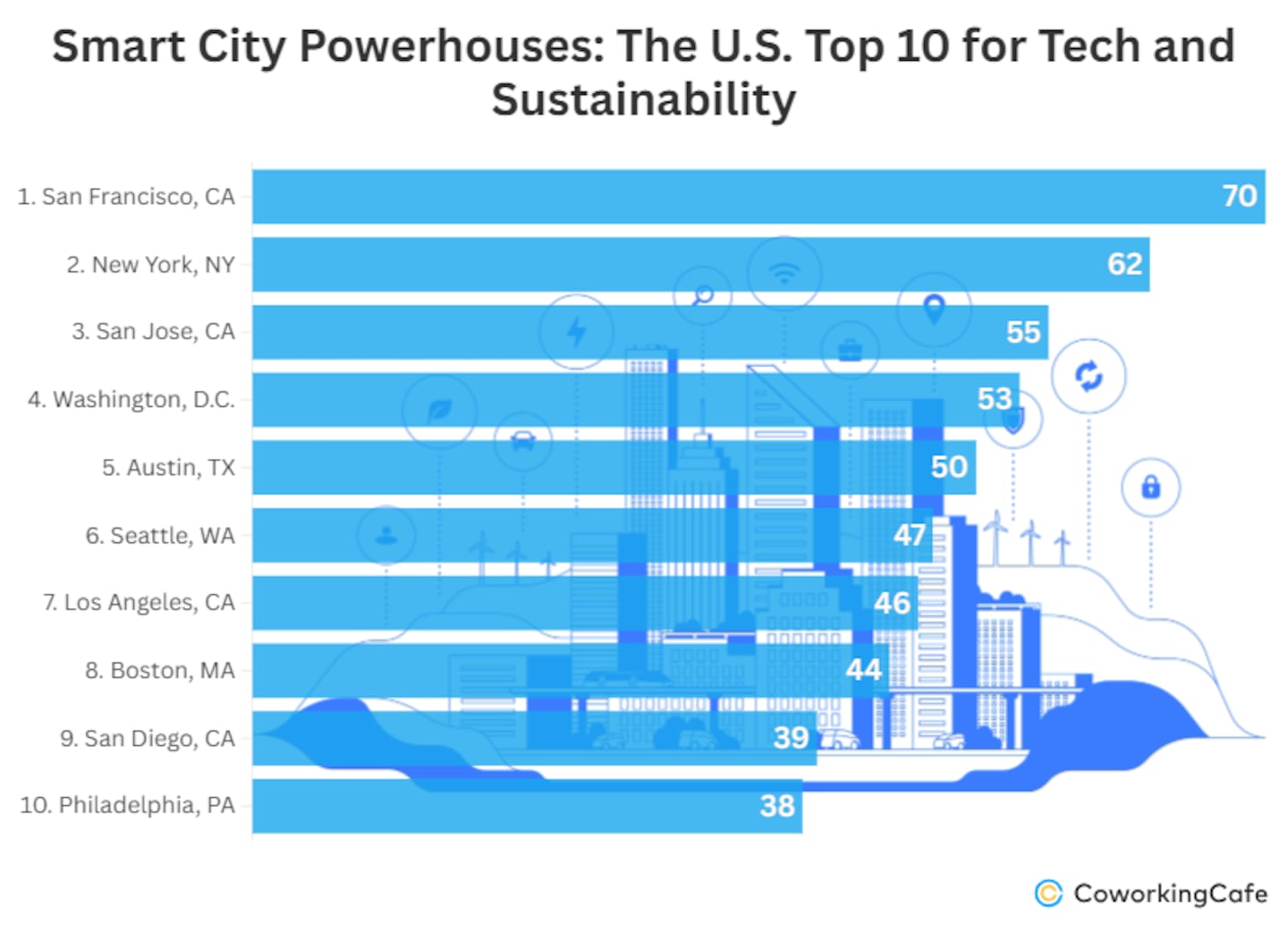 Philadelphia rounds out the top ten, scoring 38. The city excels in the percentage of electric/hybrid public transportation vehicles. As a matter of fact, 78.2% of its public transport is green, landing Philly in fourth place for this metric. It provides 58 coworking spaces and 75 free Wi-Fi hotspots, and has a strong zero-waste program. Philadelphia ranks well in AI innovation, supporting the development of cutting-edge technologies with 12 AI companies. The city also has a solid EV infrastructure, transportation connectivity, and strong broadband speed infrastructure, making it a leader in smart city planning. The local government has invested in smart lighting, traffic management systems, and digital services that enhance efficiency and sustainability.