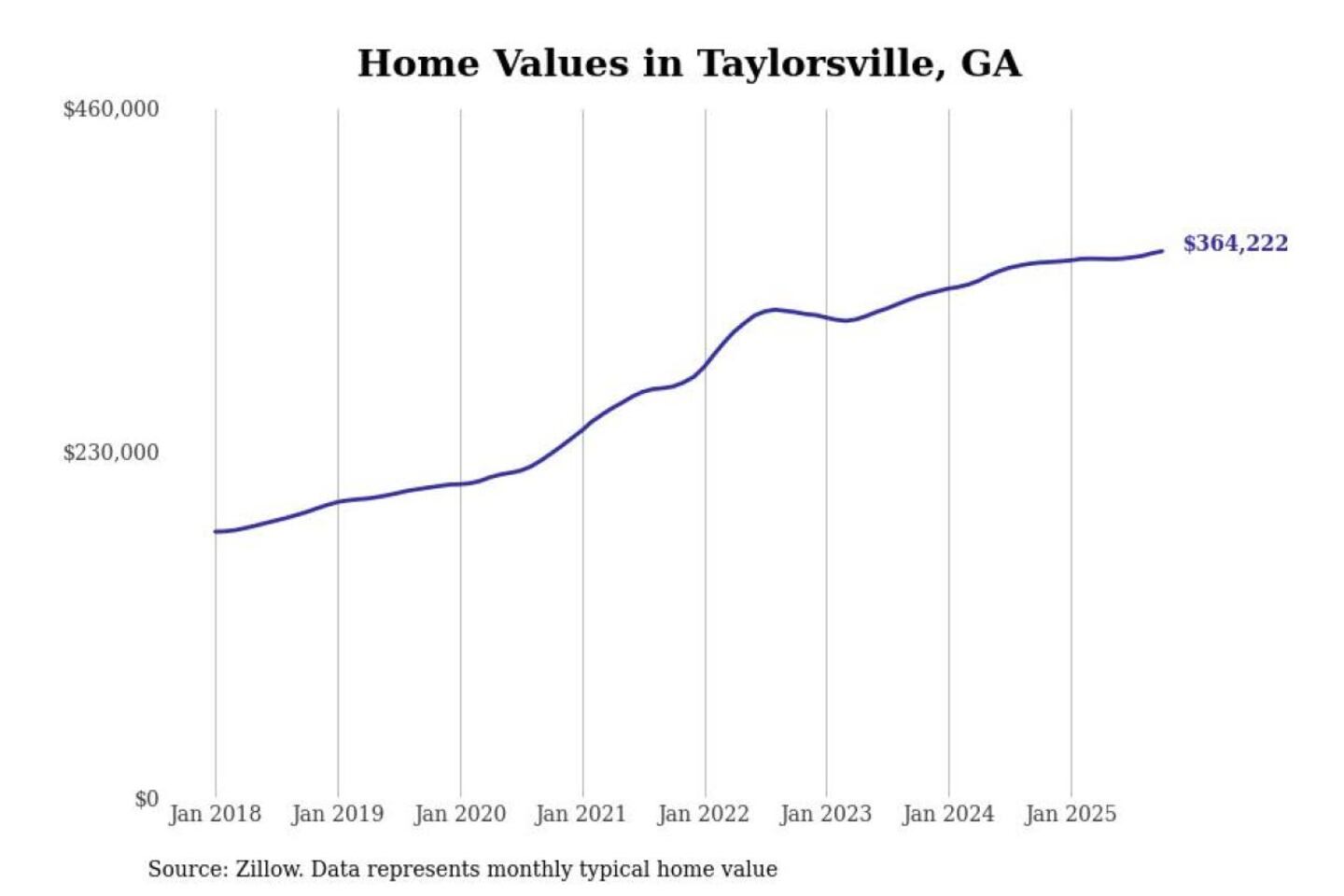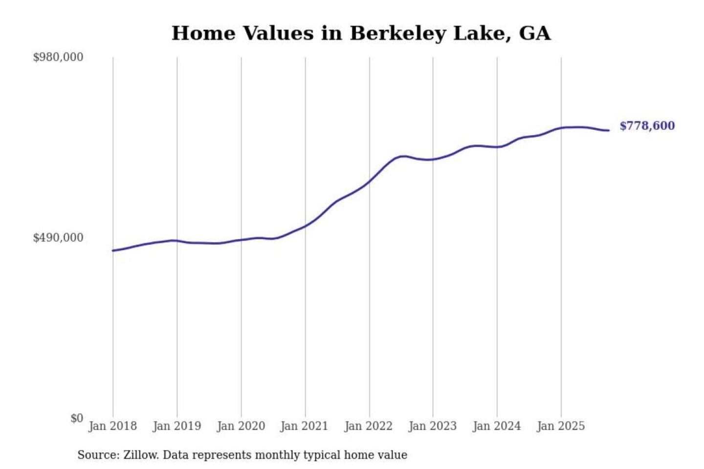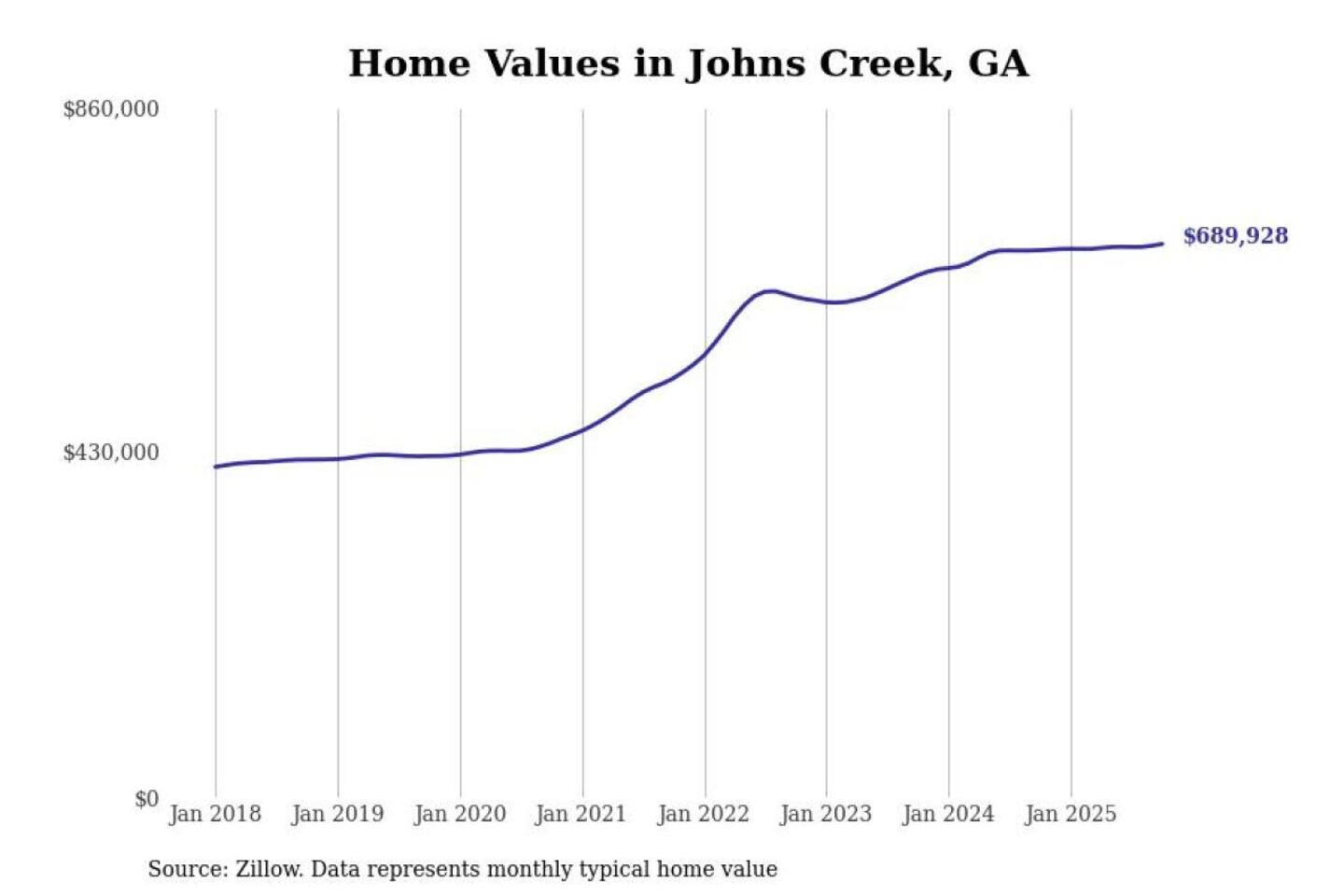 Stacker compiled a list of cities with the most expensive homes in the Atlanta-Sandy Springs-Alpharetta, GA metro area using data from Zillow. Charts show the monthly typical home value since January 2018.