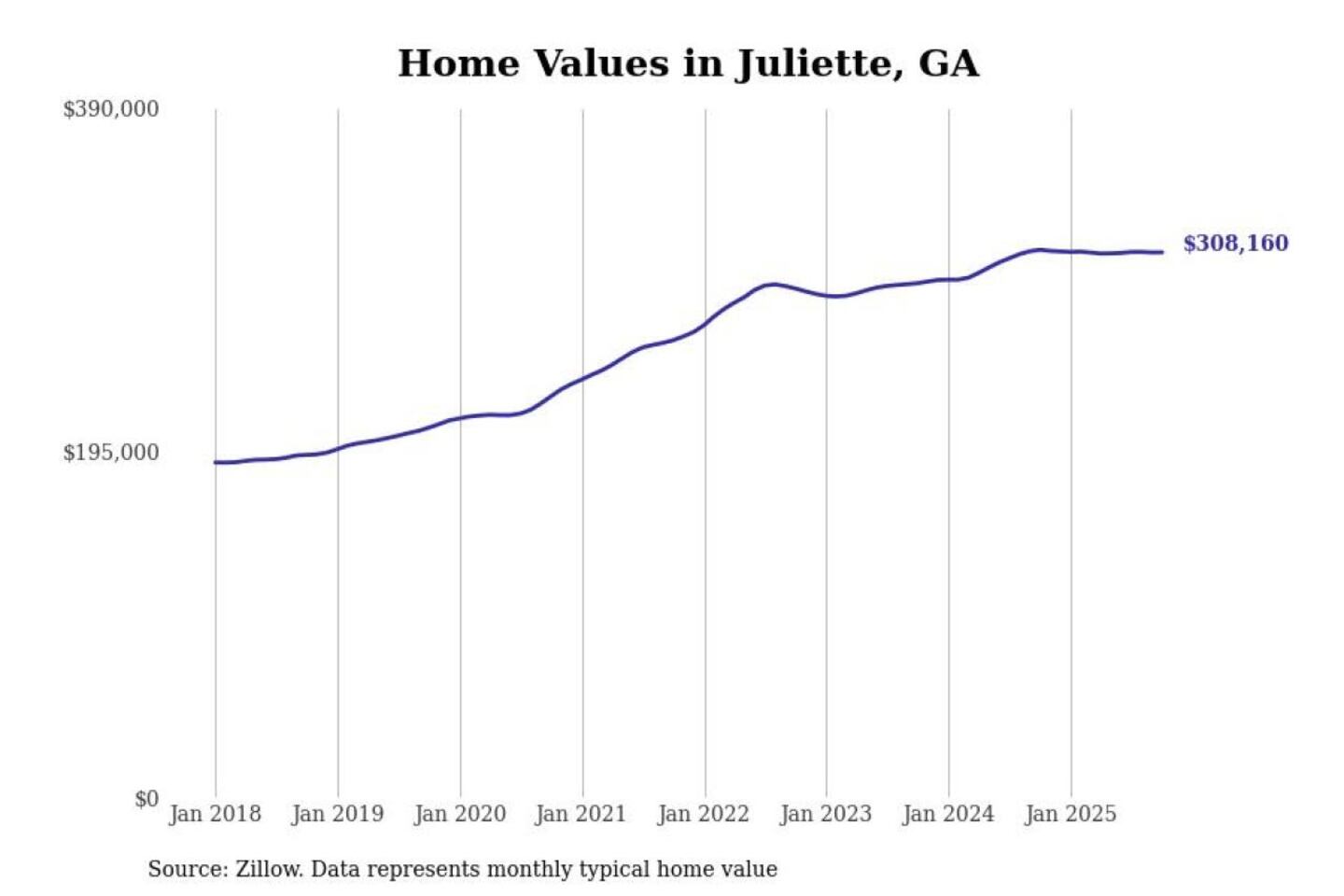 Stacker compiled a list of cities with the most expensive homes in the Macon-Bibb County, GA metro area using data from Zillow. Charts show the monthly typical home value since January 2018.