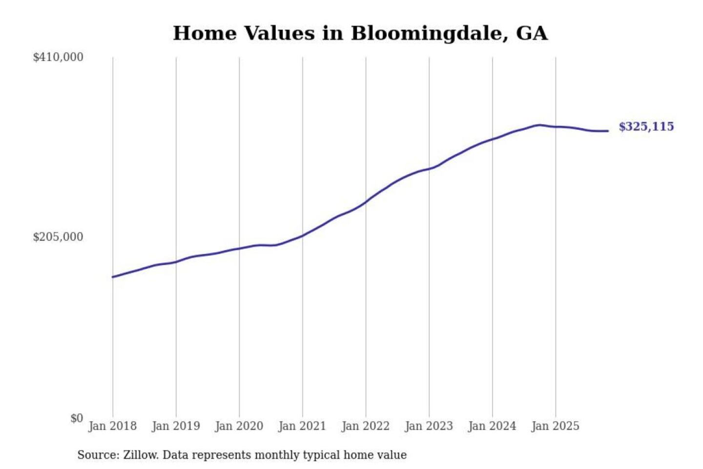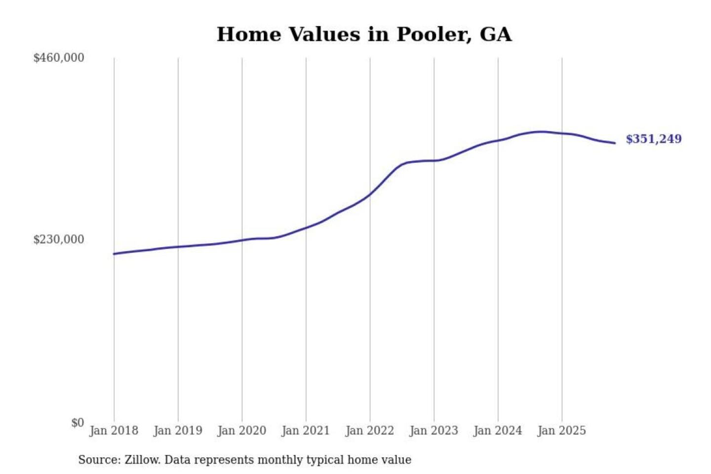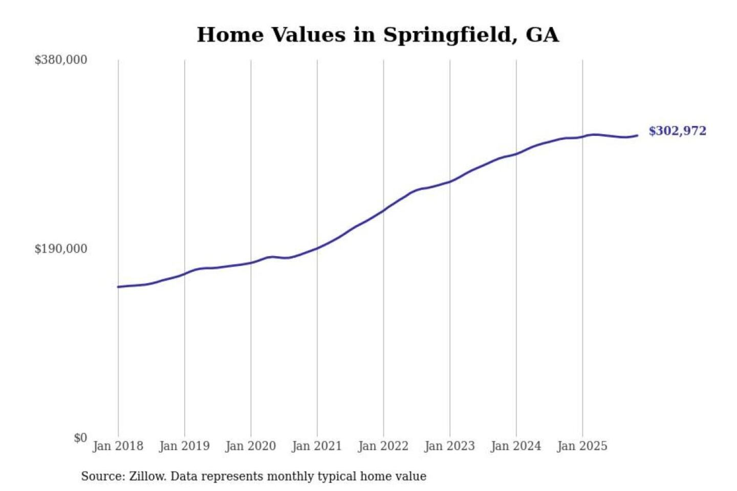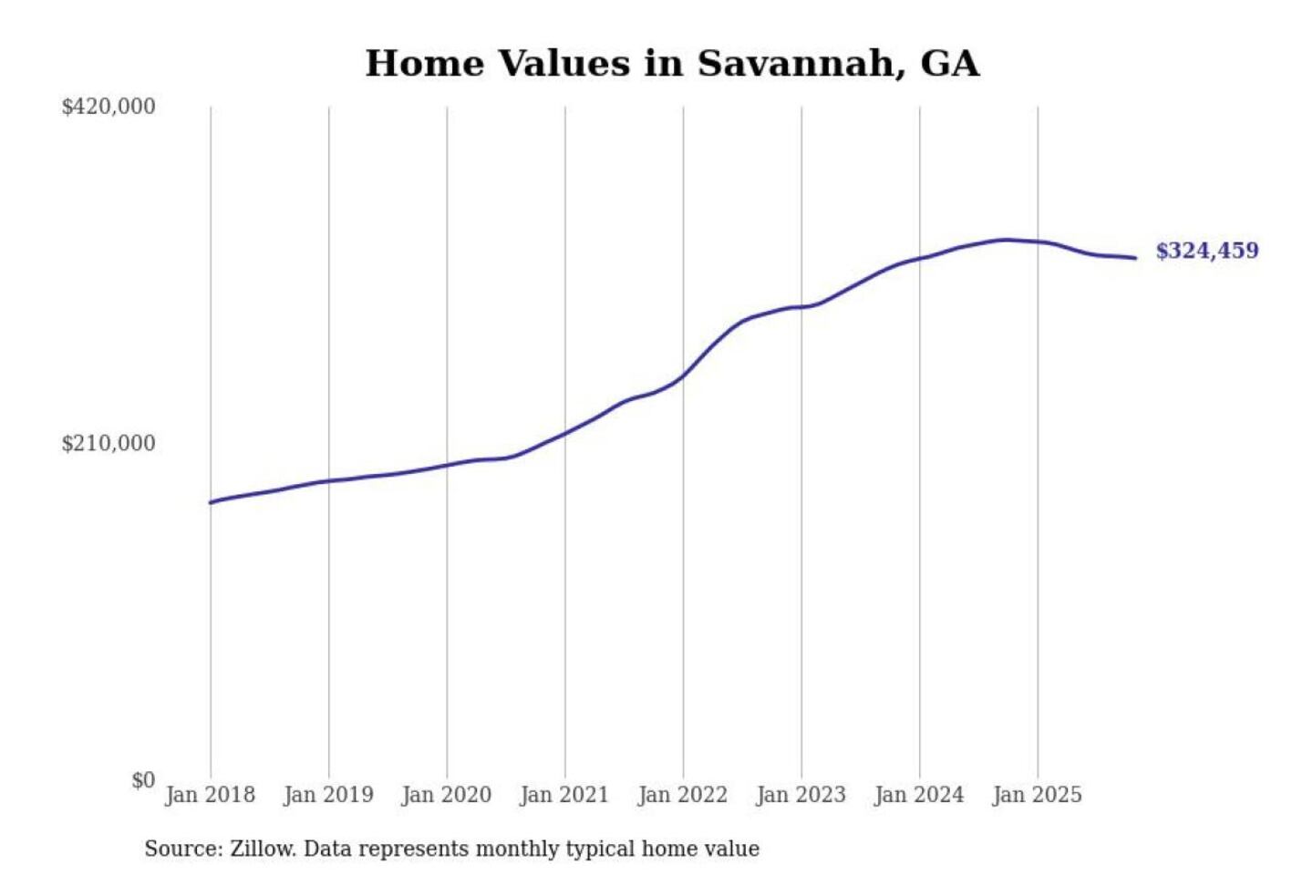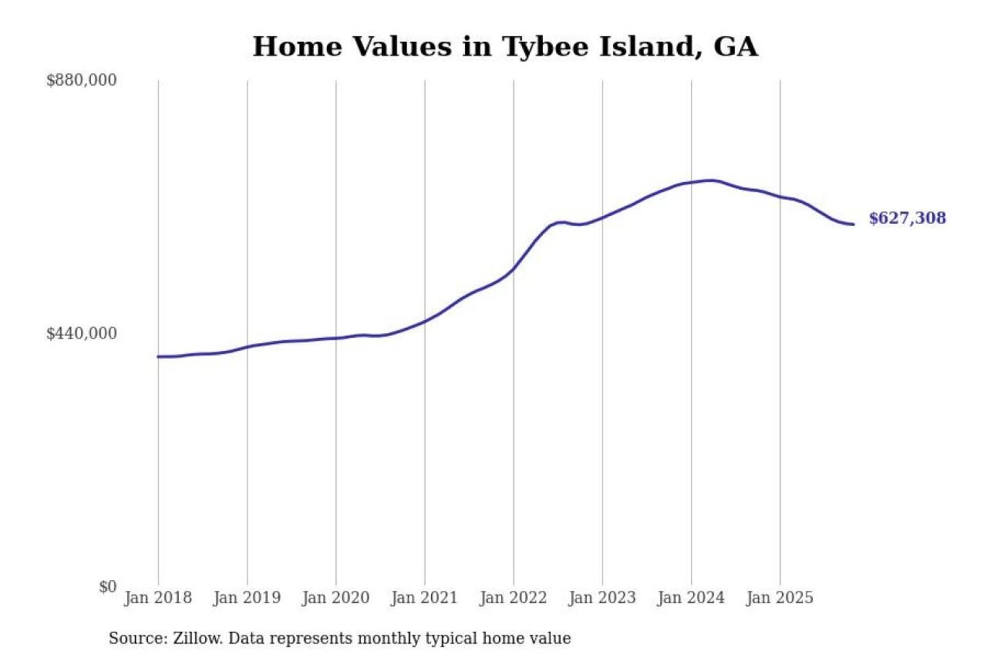 Stacker compiled a list of cities with the most expensive homes in the Savannah, GA metro area using data from Zillow. Charts show the monthly typical home value since January 2018.