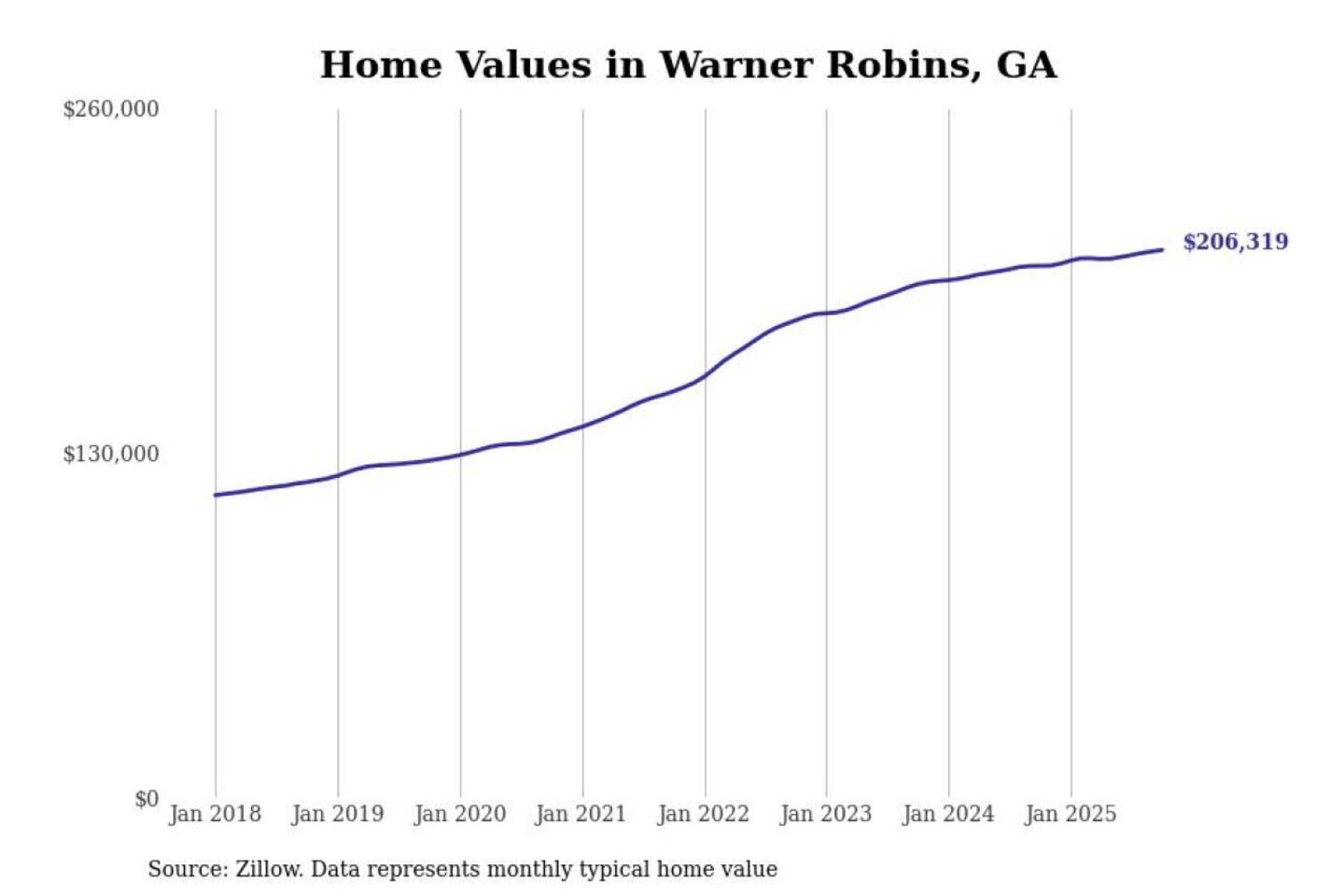 Stacker compiled a list of cities with the most expensive homes in the Warner Robins, GA metro area using data from Zillow. Charts show the monthly typical home value since January 2018.