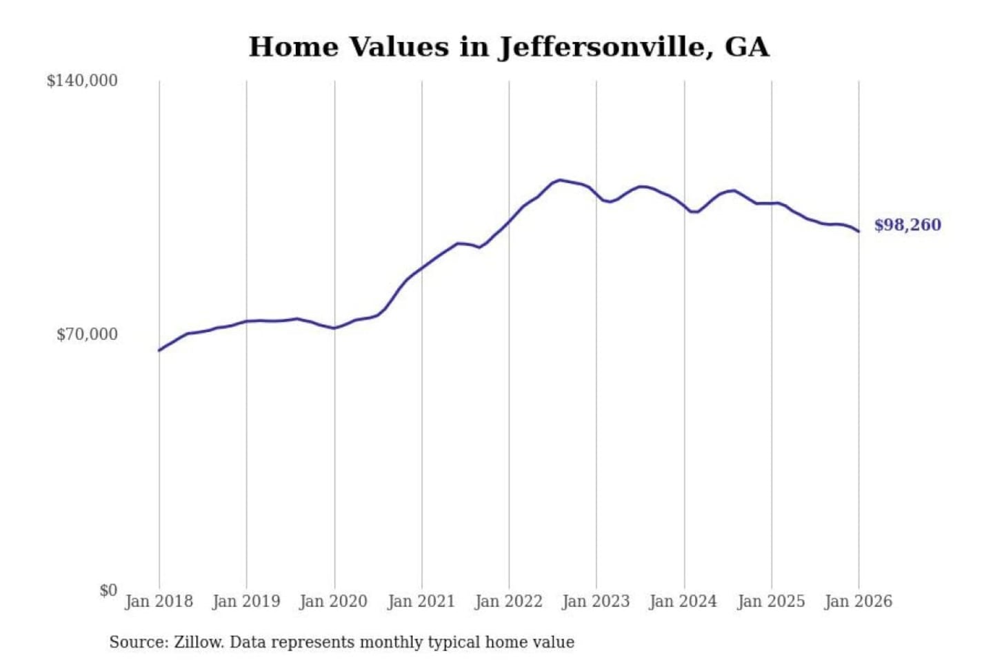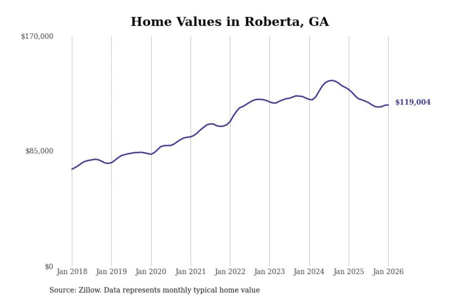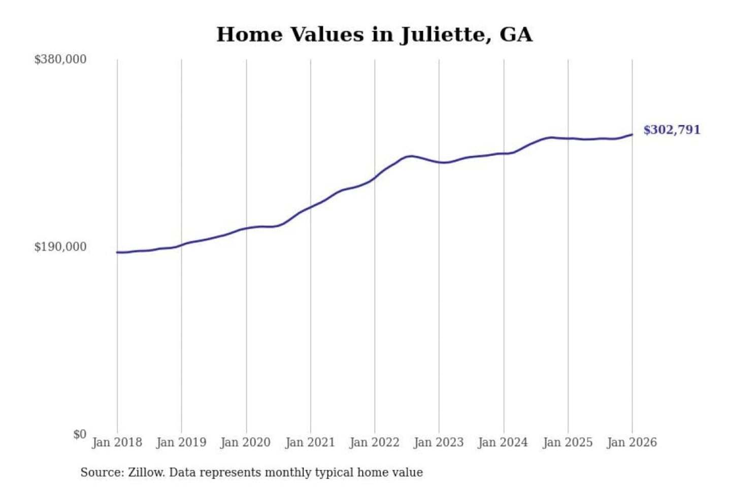 Stacker compiled a list of cities with the most expensive homes in the Macon-Bibb County, GA metro area using data from Zillow. Charts show the monthly typical home value since January 2018.
