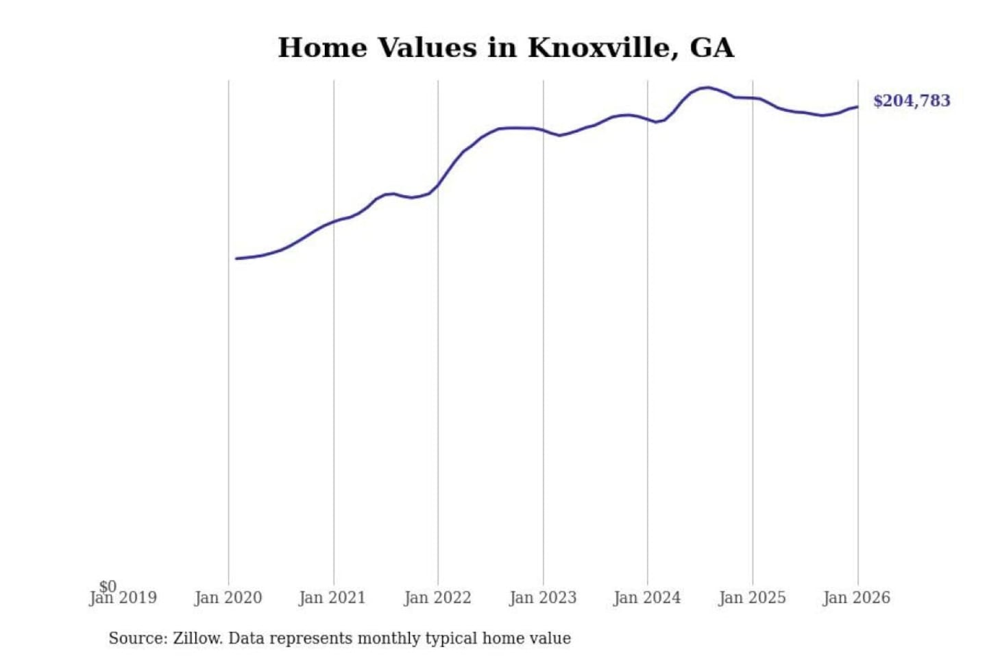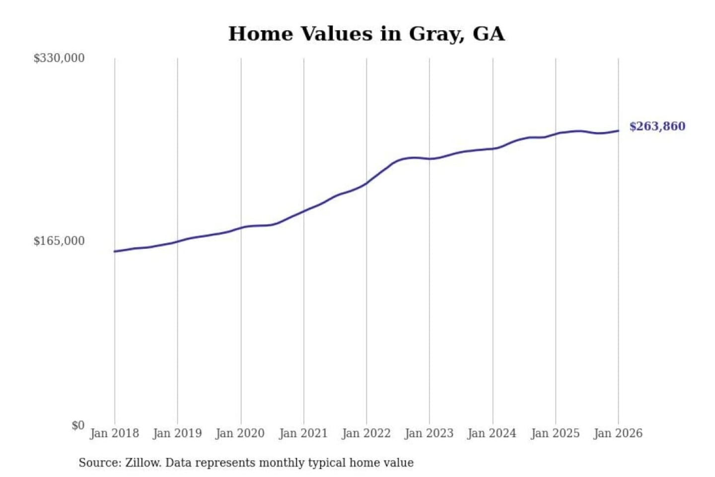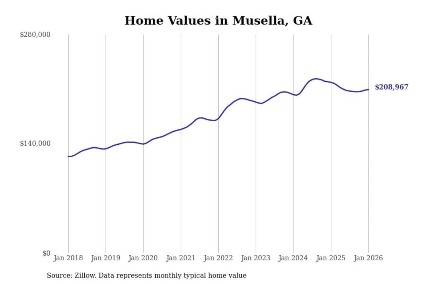 Stacker compiled a list of cities with the most expensive homes in the Macon-Bibb County, GA metro area using data from Zillow. Charts show the monthly typical home value since January 2018.