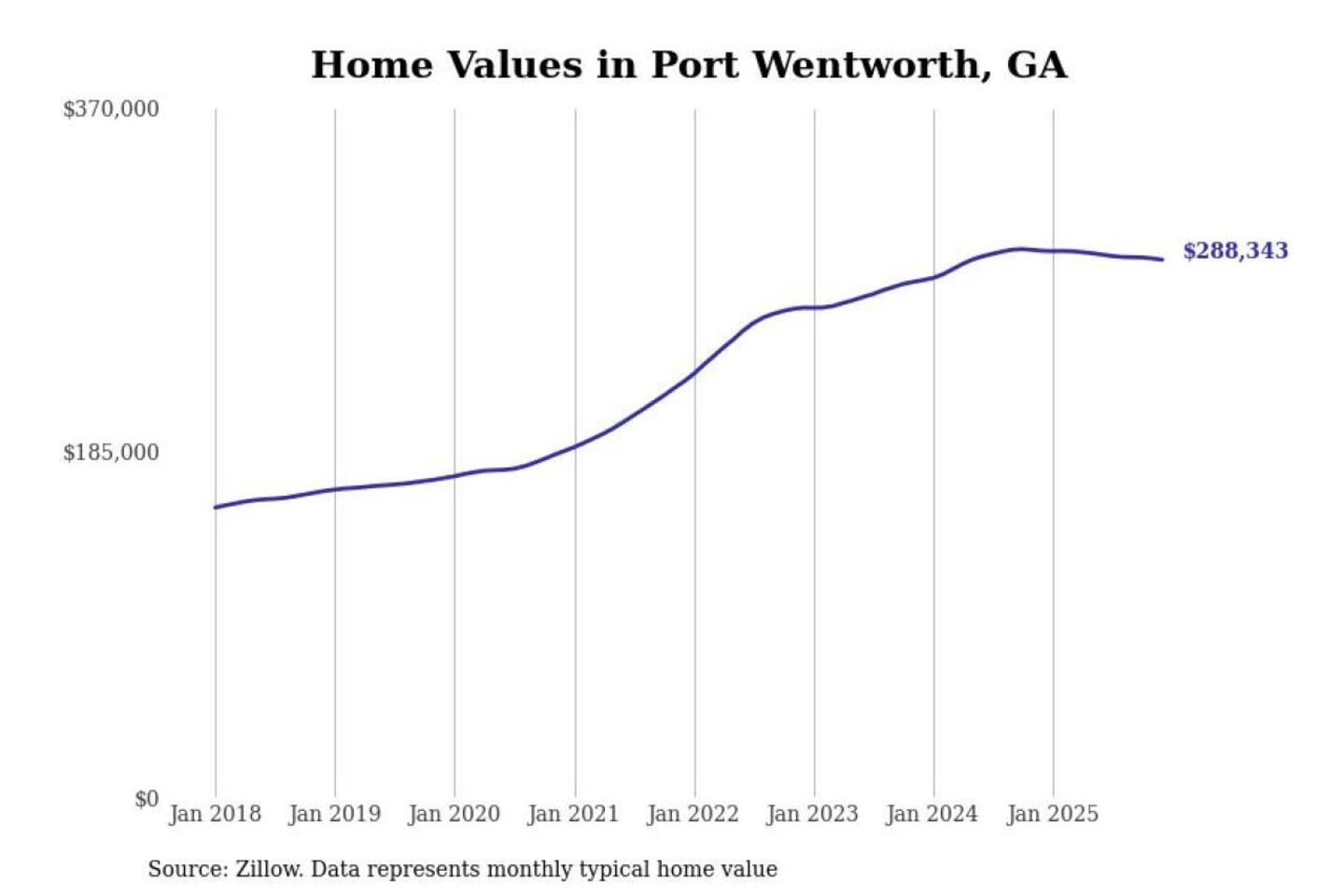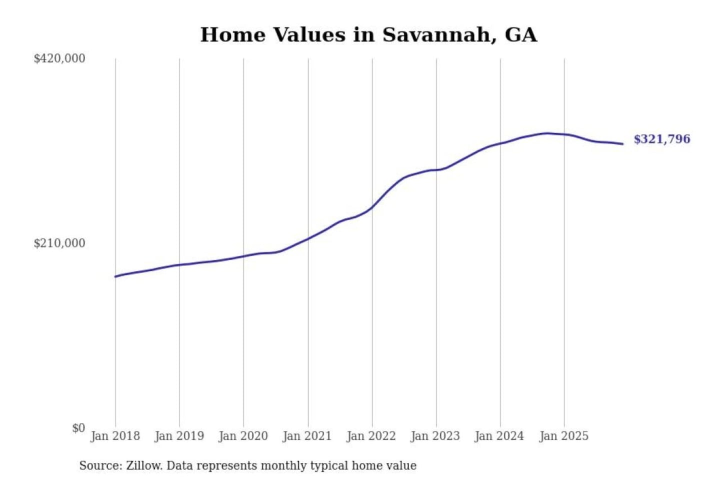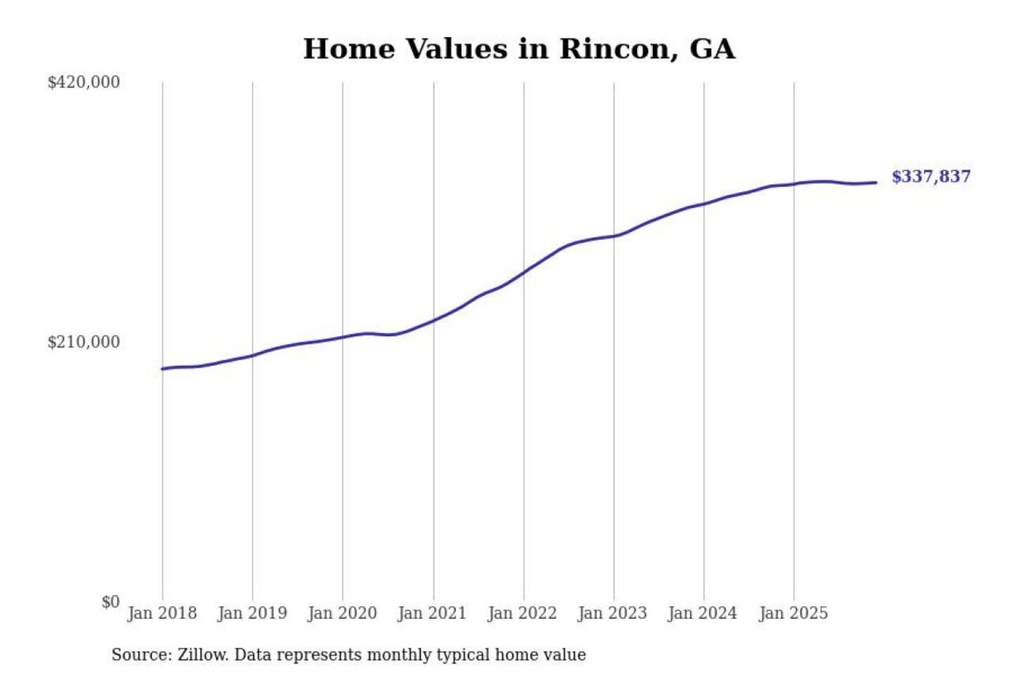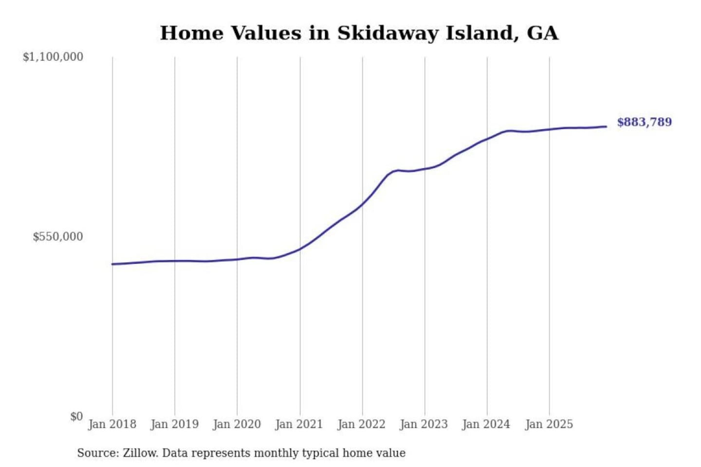 Stacker compiled a list of cities with the most expensive homes in the Savannah, GA metro area using data from Zillow. Charts show the monthly typical home value since January 2018.