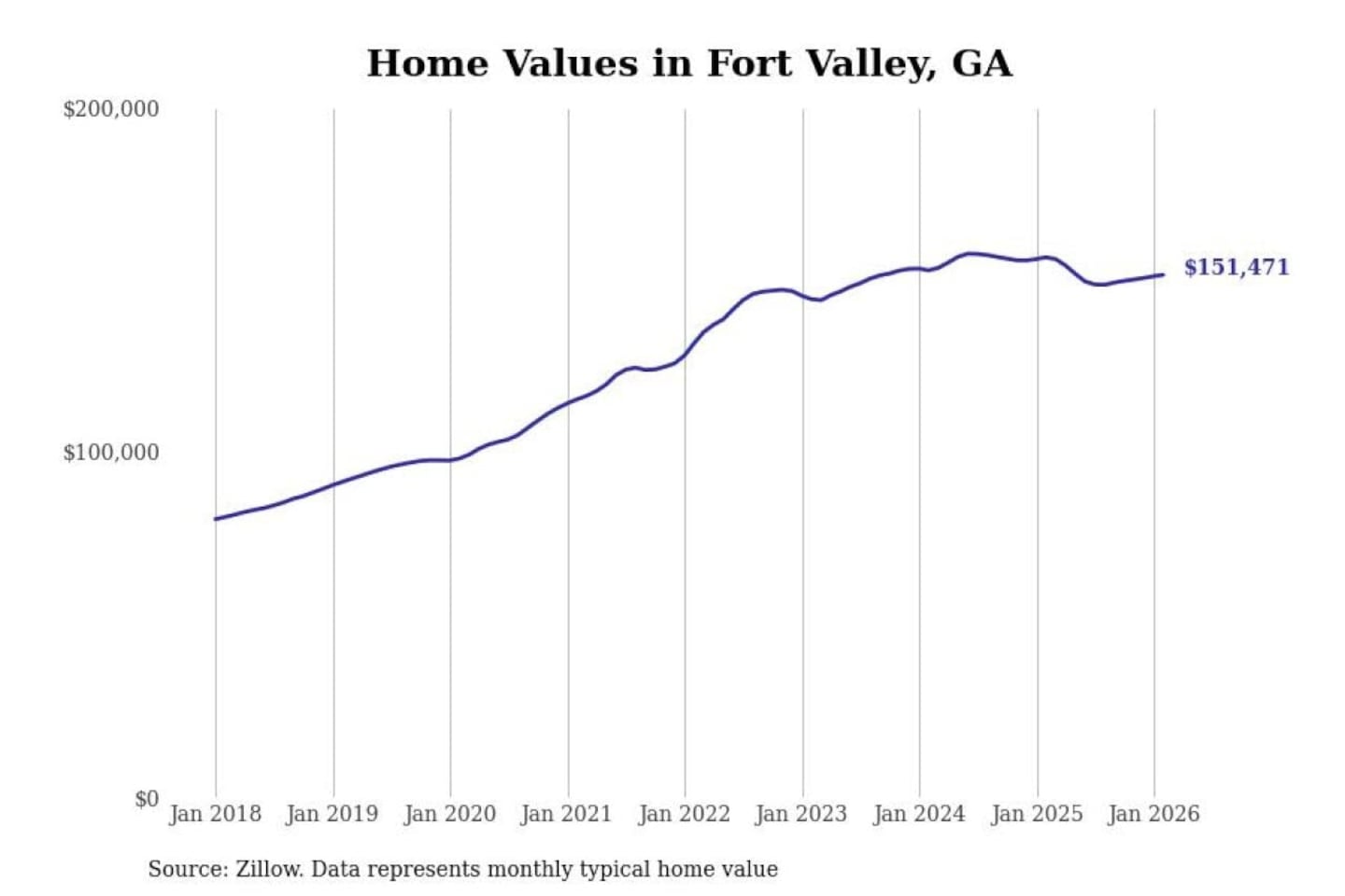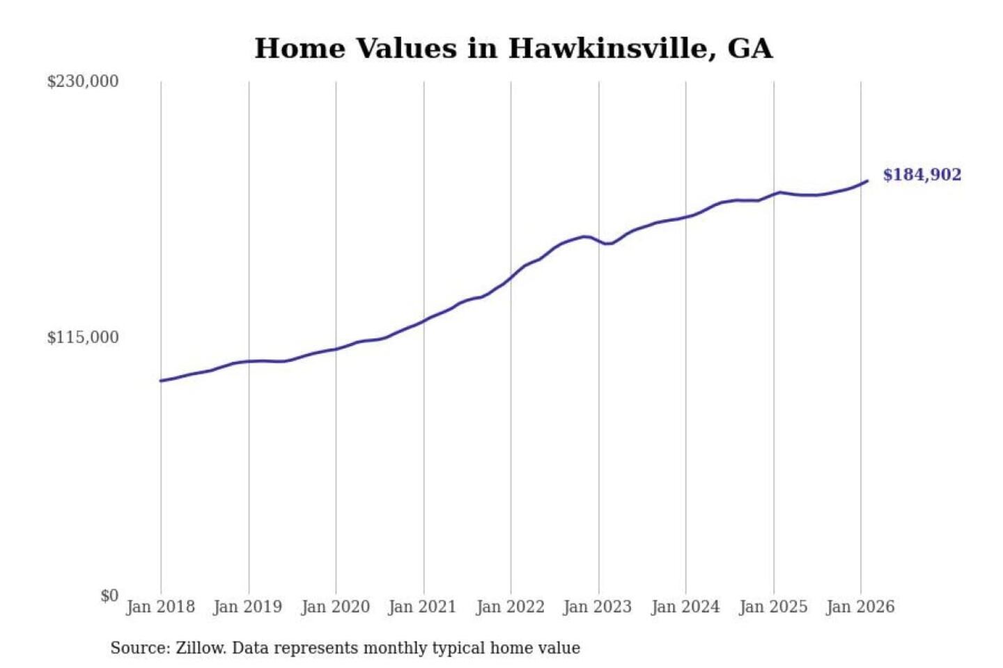 Stacker compiled a list of cities with the most expensive homes in the Warner Robins, GA metro area using data from Zillow. Charts show the monthly typical home value since January 2018.