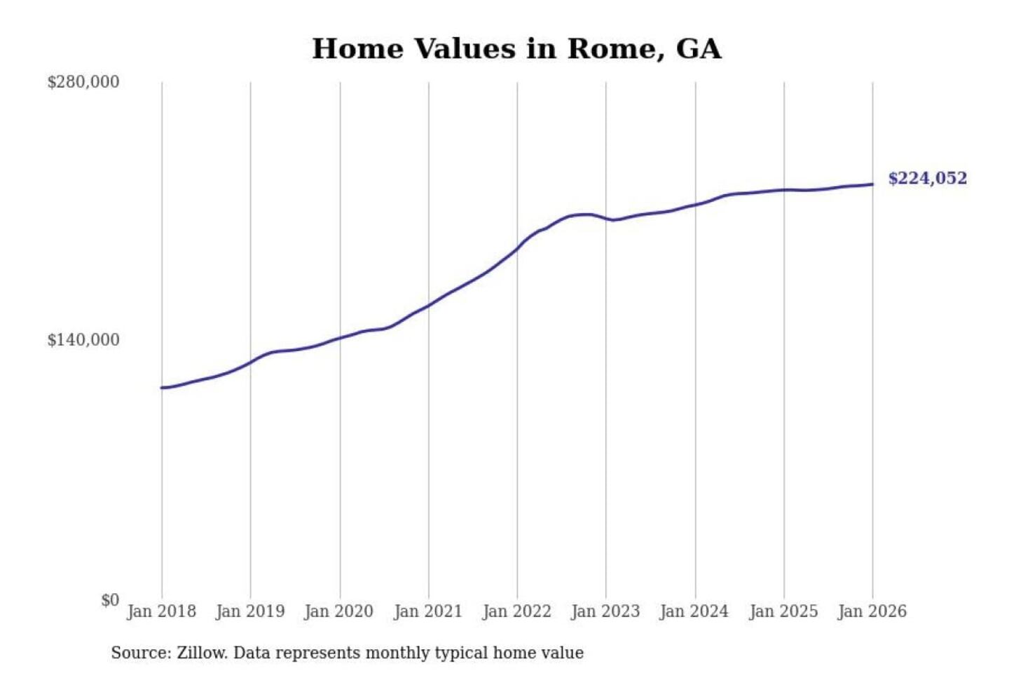 Stacker compiled a list of cities with the most expensive homes in the Rome, GA metro area using data from Zillow. Charts show the monthly typical home value since January 2018.