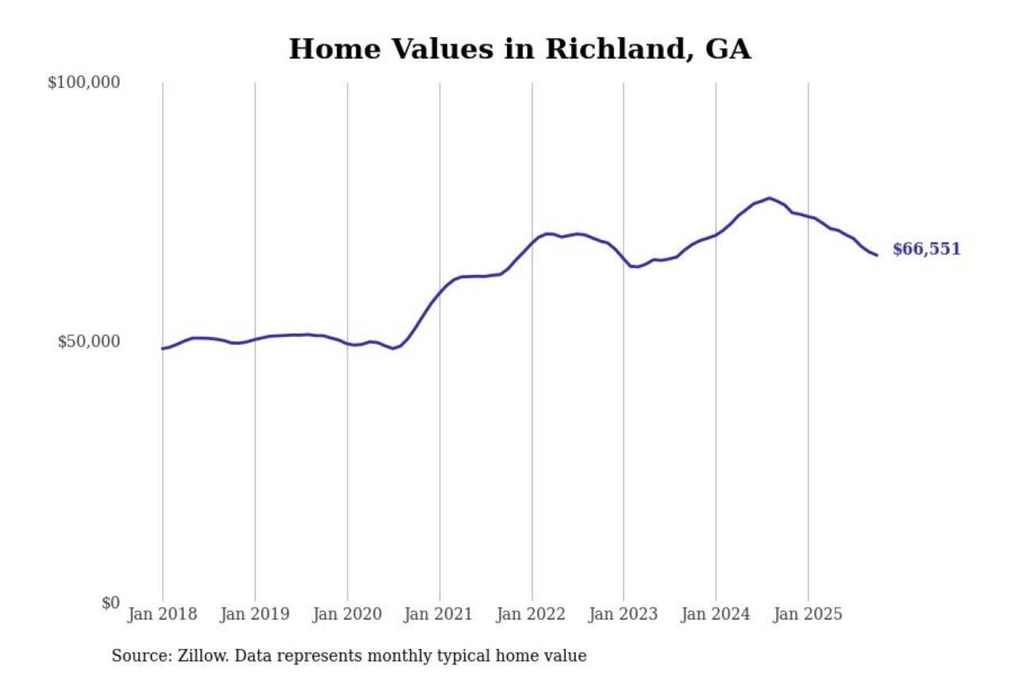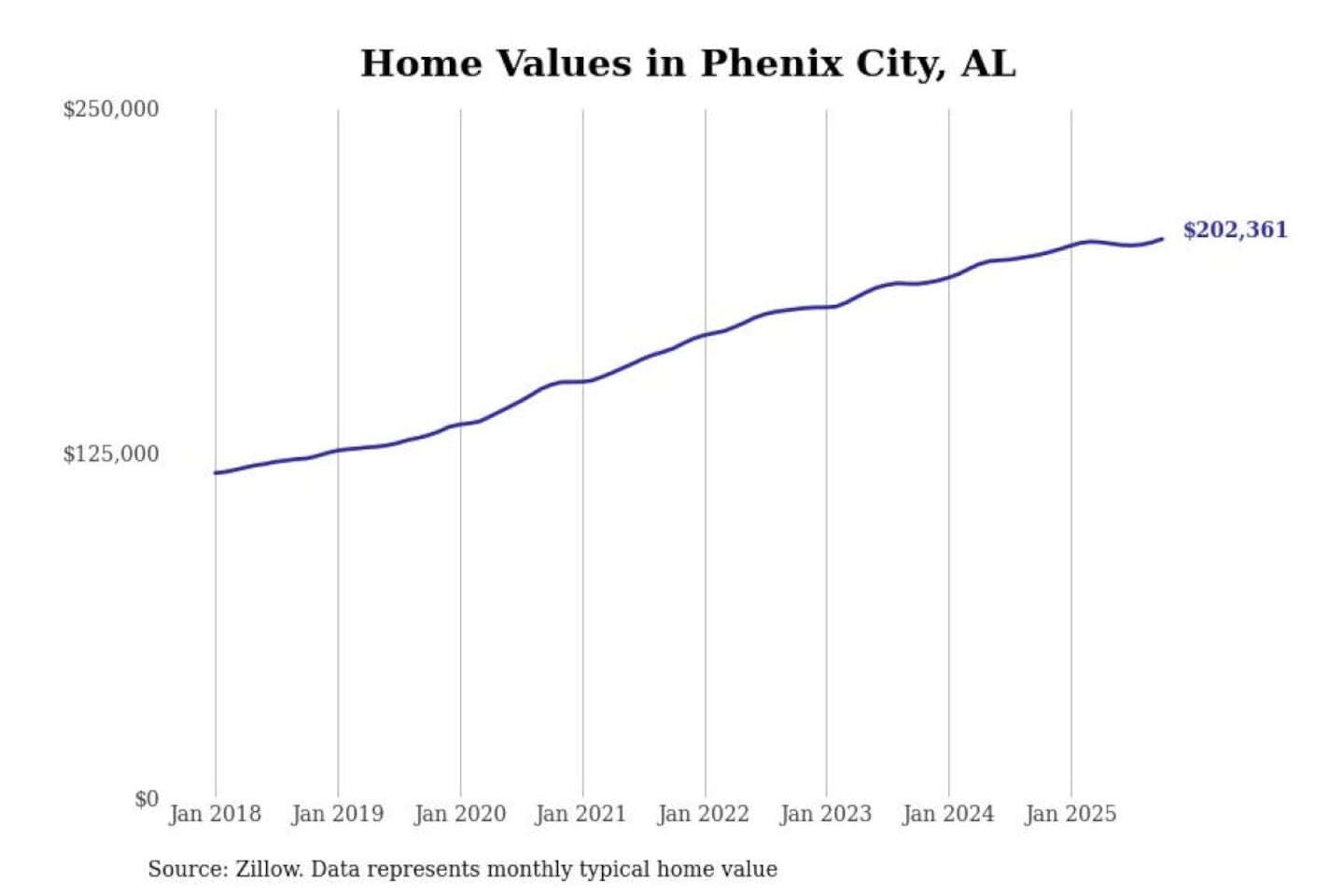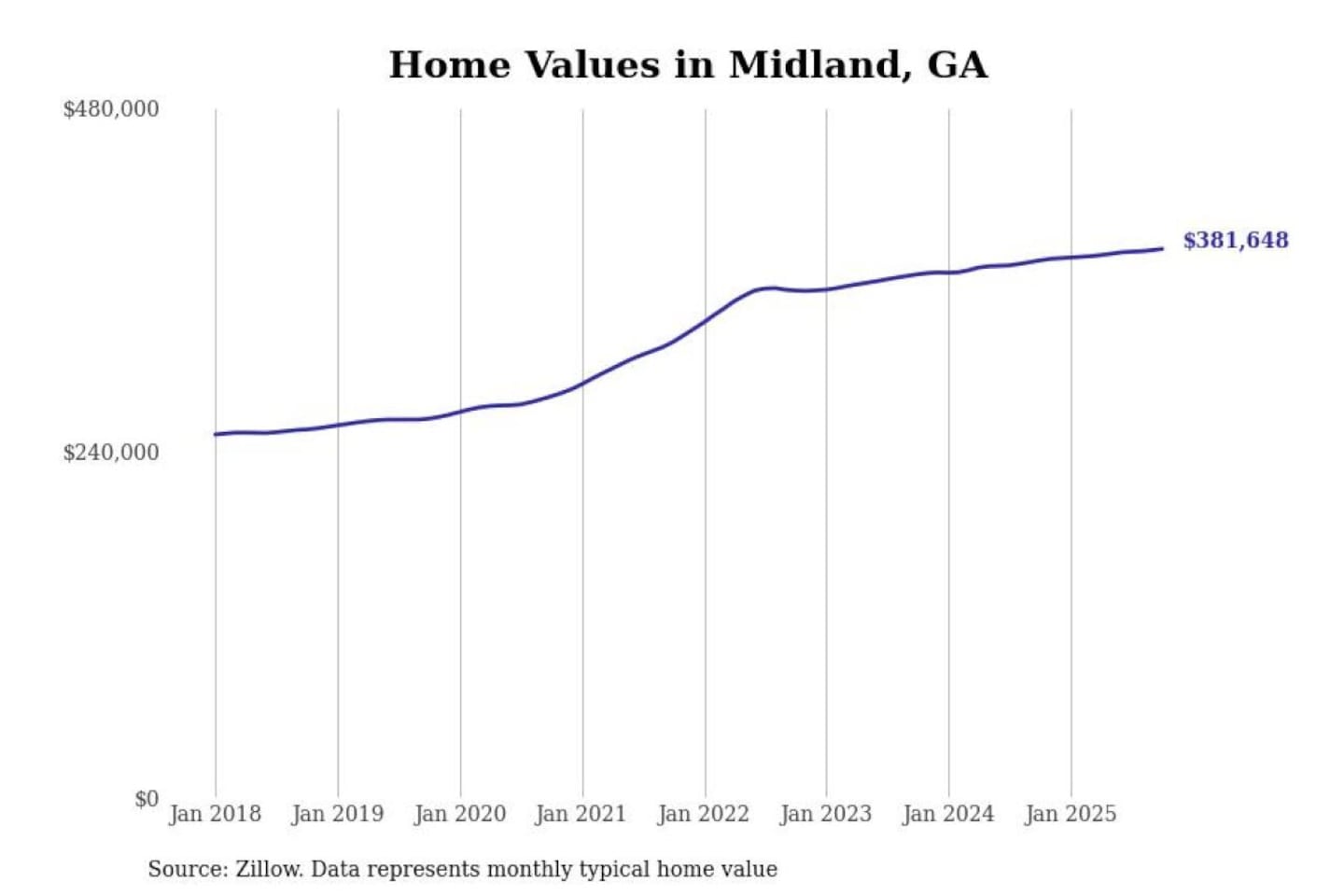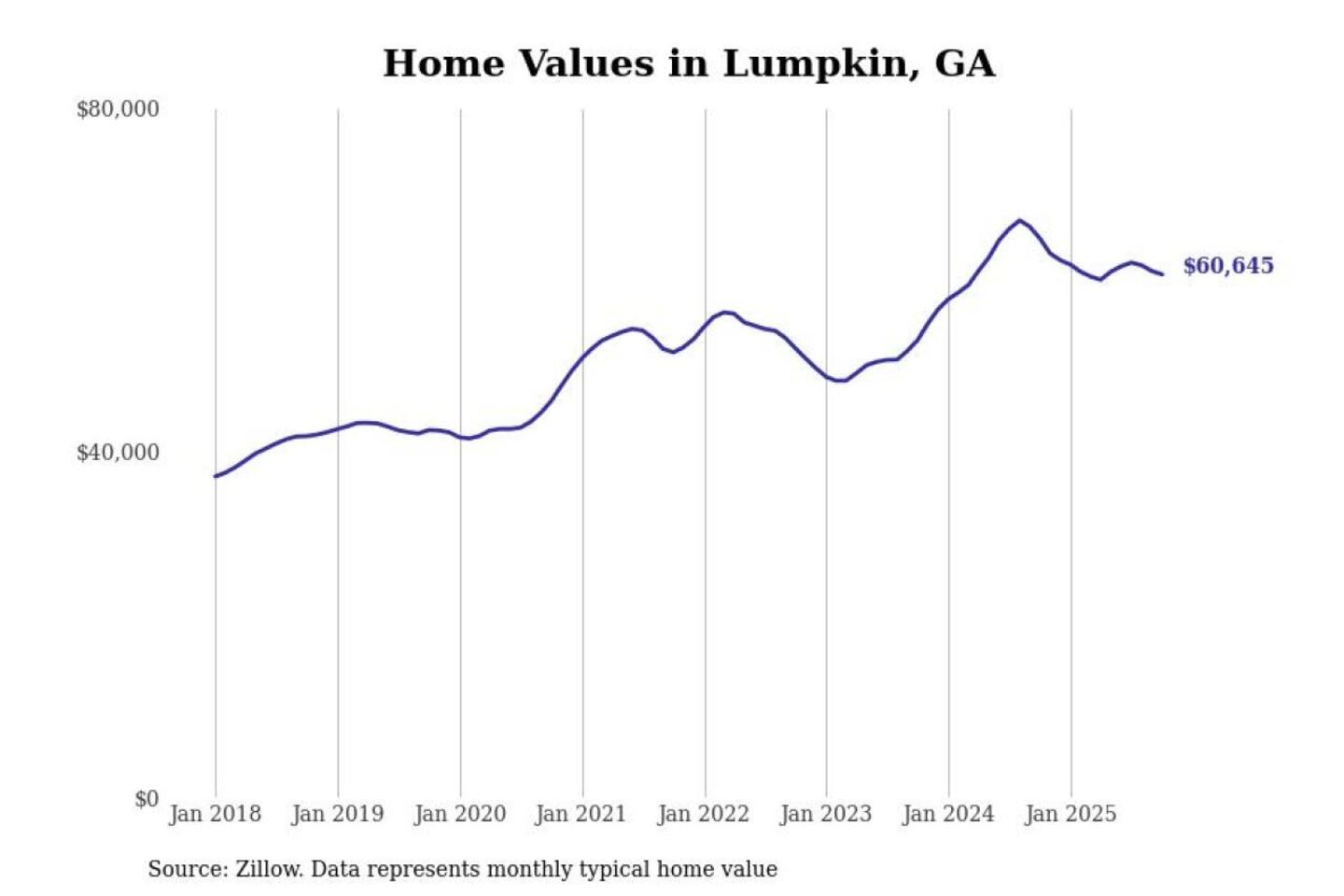 Stacker compiled a list of cities with the most expensive homes in the Columbus, Georgia metro area using data from Zillow. Charts show the monthly typical home value since January 2018. All 23 cities and towns with data available were included in the list.