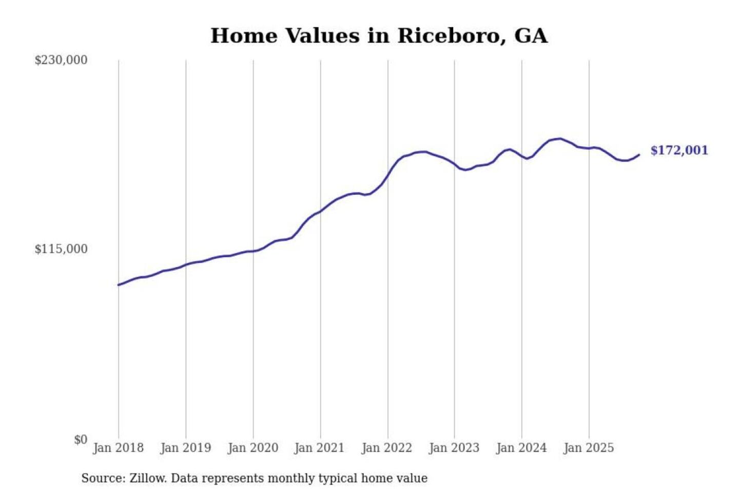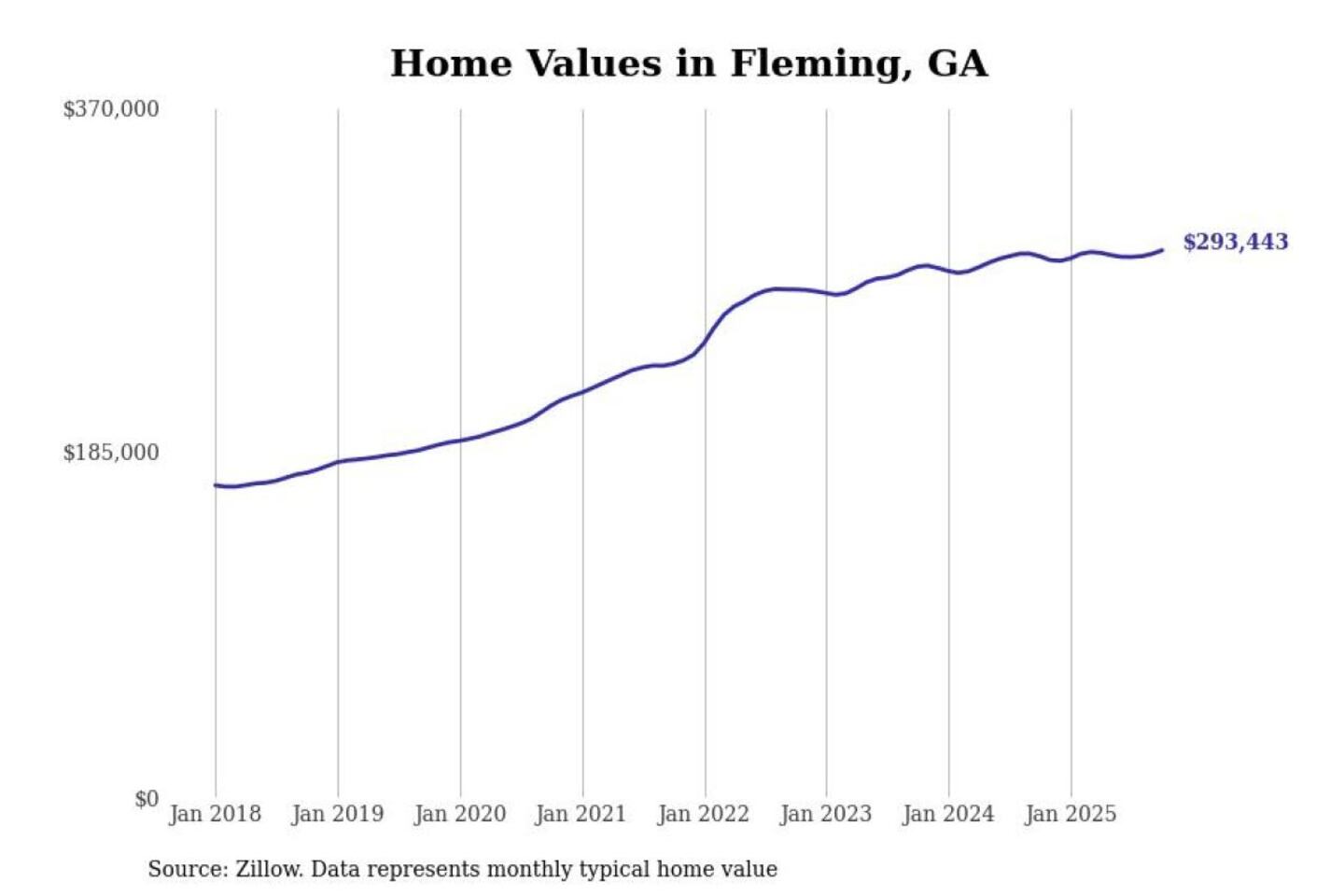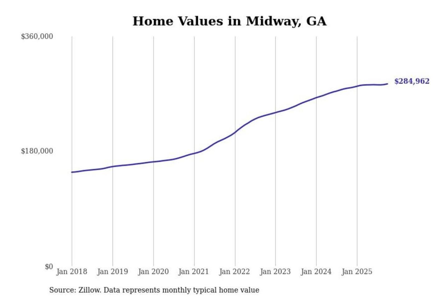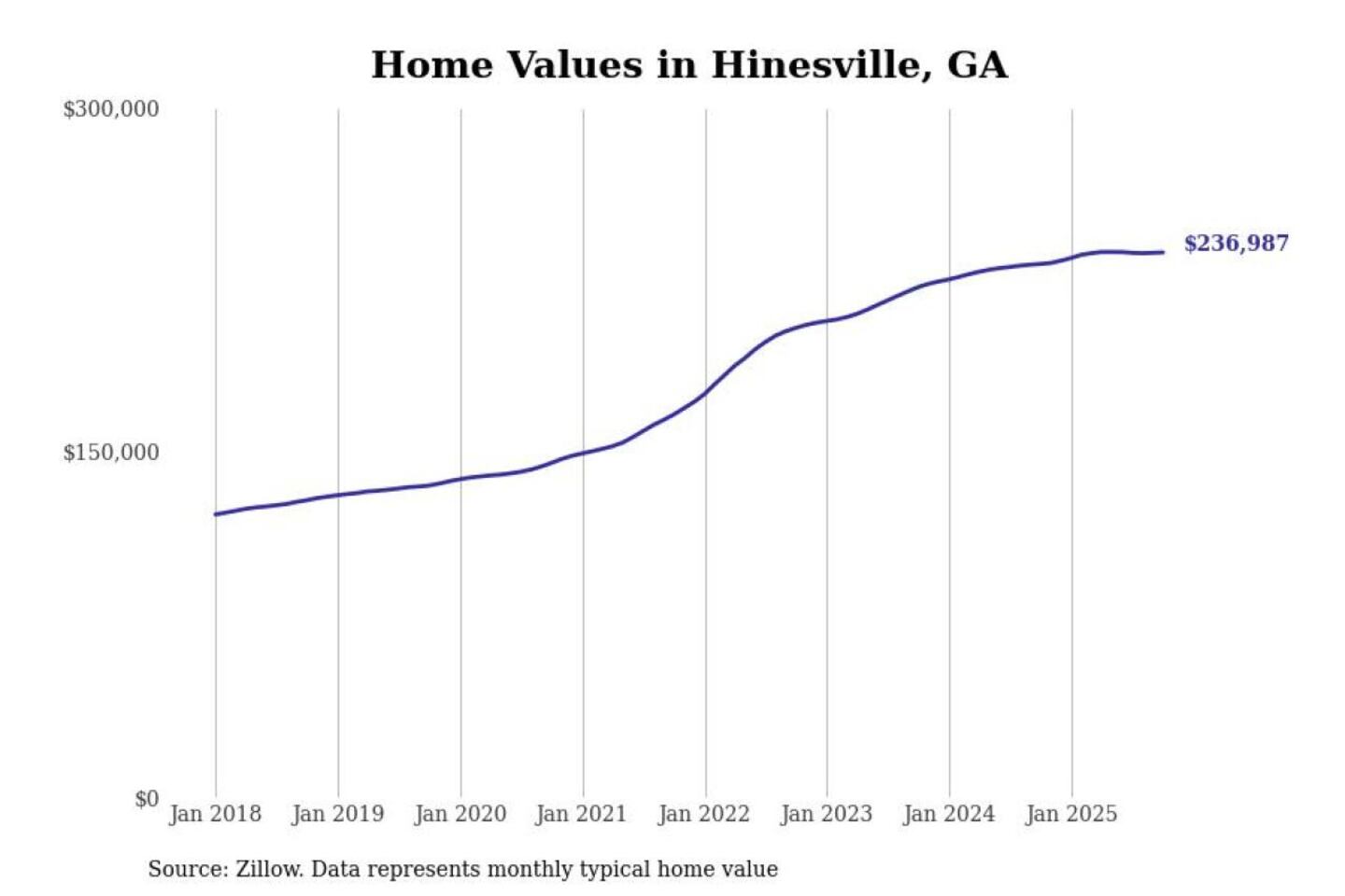 Stacker compiled a list of cities with the most expensive homes in the Hinesville metro area using data from Zillow. Charts show the monthly typical home value since January 2018. All 8 cities and towns with data available were included in the list.