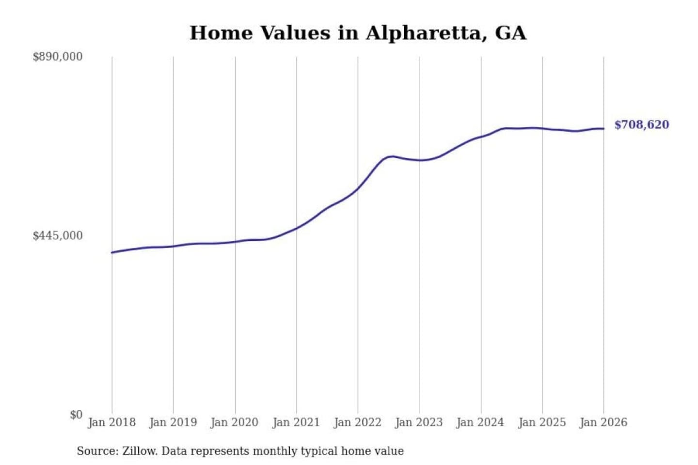 Stacker compiled a list of cities with the most expensive homes in Georgia using data from Zillow. Cities are ranked by the Zillow Home Values Index for all homes as of January 2026. The charts in this story were created automatically using Matplotlib.