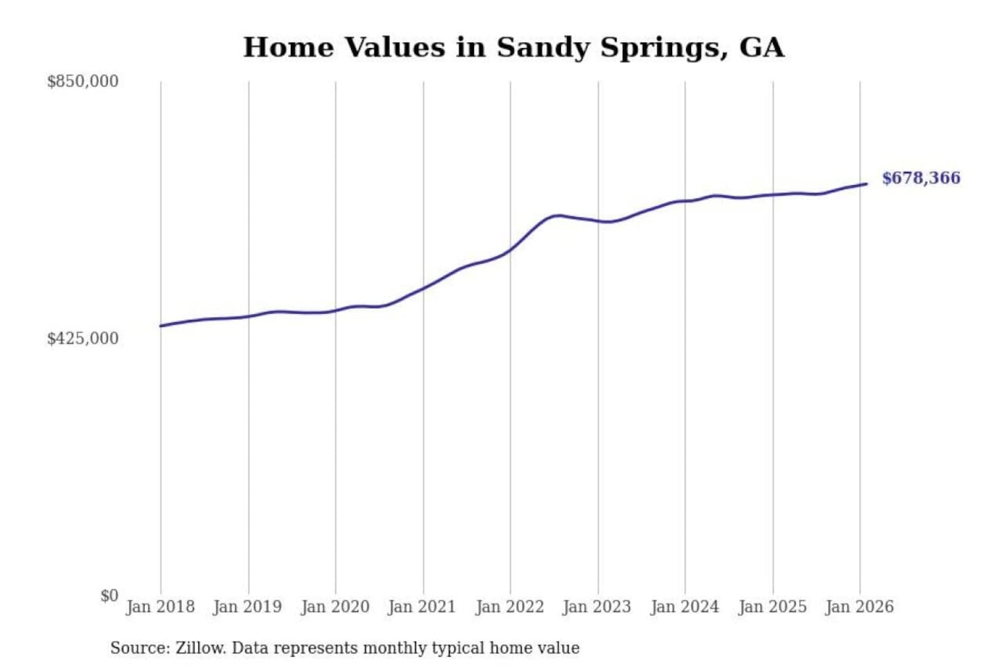 Stacker compiled a list of cities with the most expensive homes in Georgia using data from Zillow. Cities are ranked by the Zillow Home Values Index for all homes as of February 2026. The charts in this story were created automatically using Matplotlib.