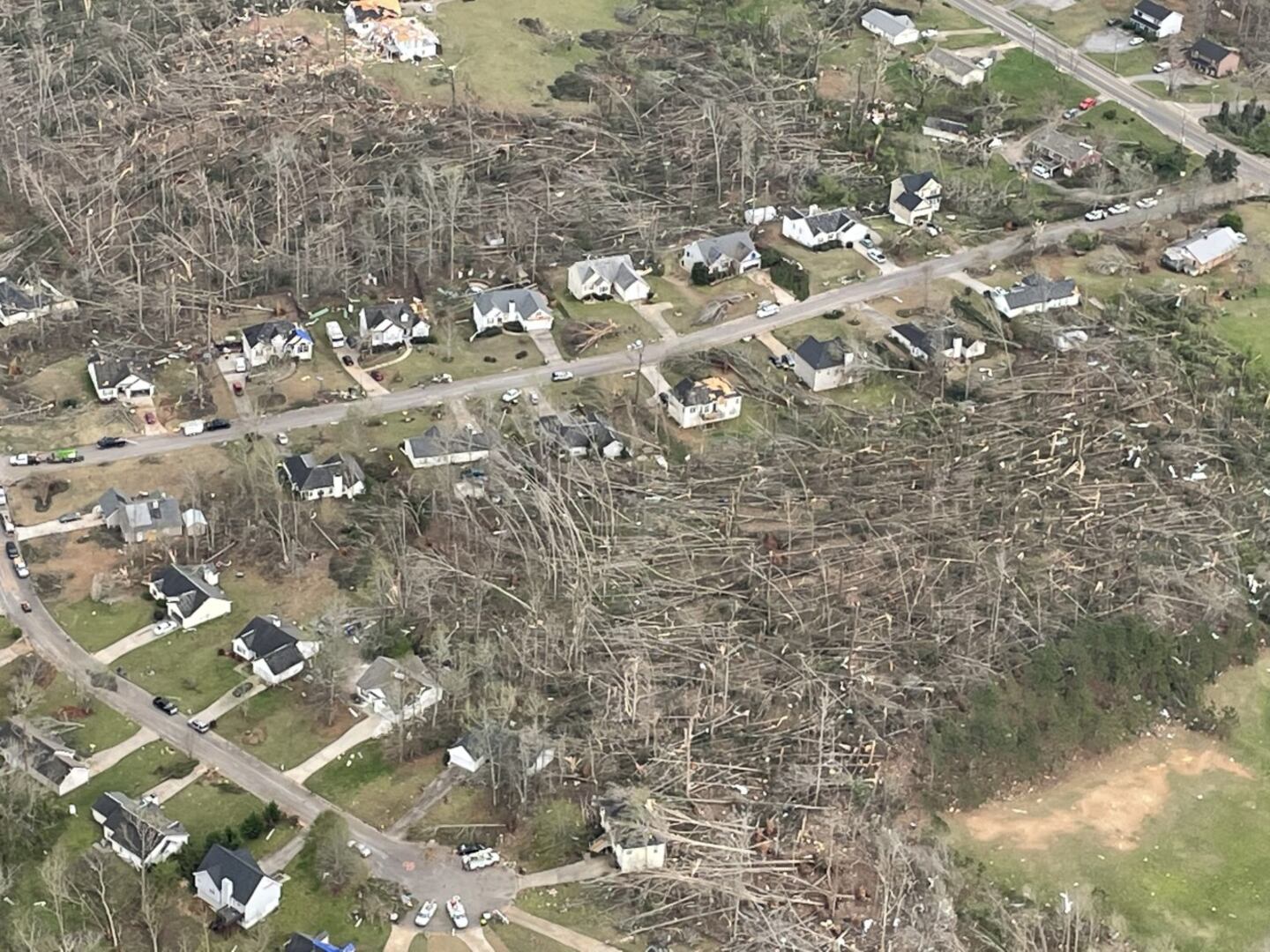 From high above, you can see the destruction left on the ground by a reported EF-4 tornado. WSB Radio traffic reporter Mark McKay snapped pictures that reveal a long trail of damage through neighborhoods and the campus of Newnan High School.