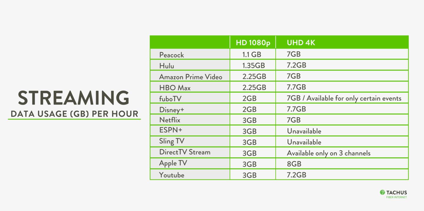 Tachus tested the hourly data requirements for standard definition, high-definition and ultra-high definition for many of the most popular streaming TV services: