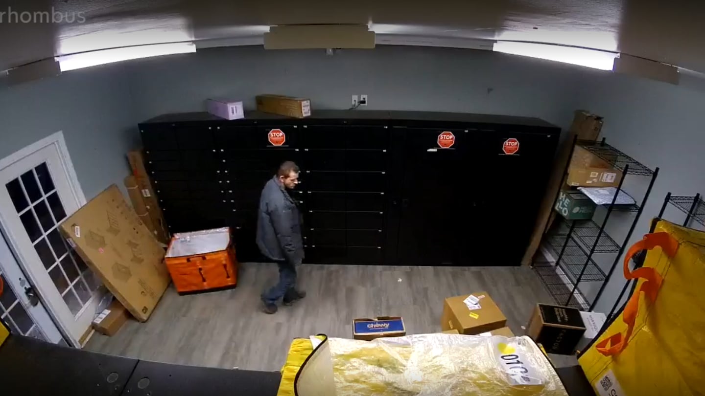 The suspect is seen going through some of the packages and putting it into a bag. At one point, the suspect grabbed a large package and walked out of the room.