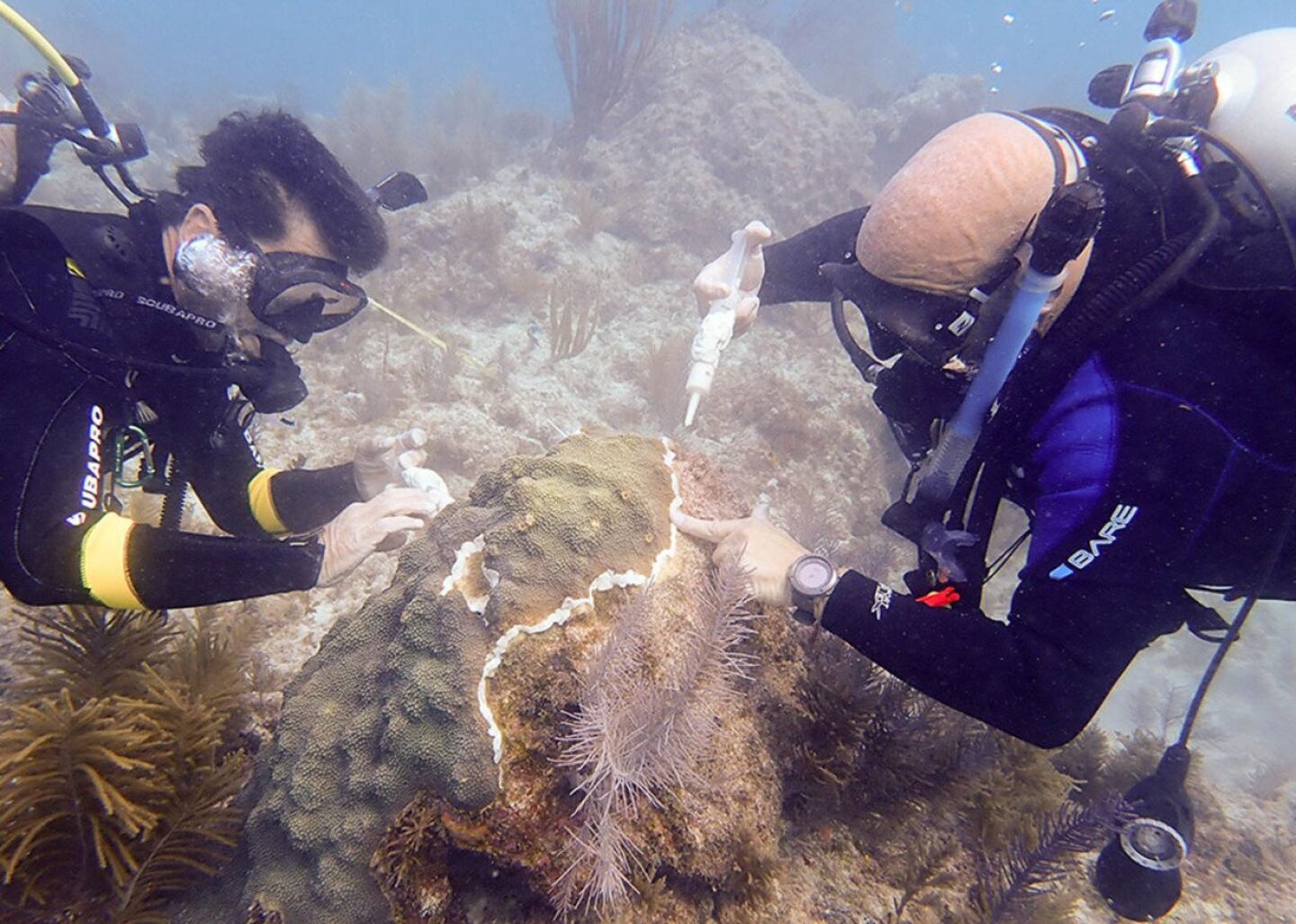 For instance, in 2017, Force Blue deployed to Puerto Rico after Hurricane Maria and to Florida after Hurricane Irma to assist with emergency coral reef recovery and restoration efforts in damaged reefs. In 2018, the Florida Department of Environmental Protection approached Force Blue to monitor and curb the spread of Stony Coral Tissue Loss Disease. The disease, which affects half of the coral species in the Florida Keys, completely destroys the soft tissue of infected corals, resulting in their death, often within a matter of weeks. The organization was tasked with studying an 80-mile stretch of reefs along the Florida Keys treating the afflicted corals with antibiotics. "I hadn't quite realized how important corals are for the marine life and life in general," says Force Blue volunteer Duncan Baillie, who spent 25 years in the British military and now lives in Florida. He helped replant coral from nurseries.