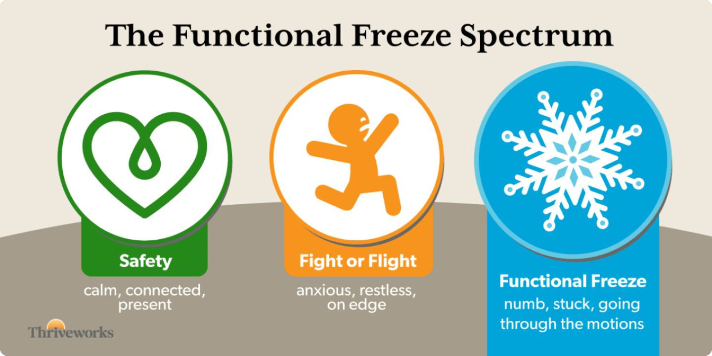 Functional freeze is a mental state where a person continues daily activities—such as going to work, answering emails, fitting in a workout, and showing up at social events—yet feels emotionally numb or disconnected. Functional freeze typically occurs as a response to intense or ongoing stress and overstimulation.