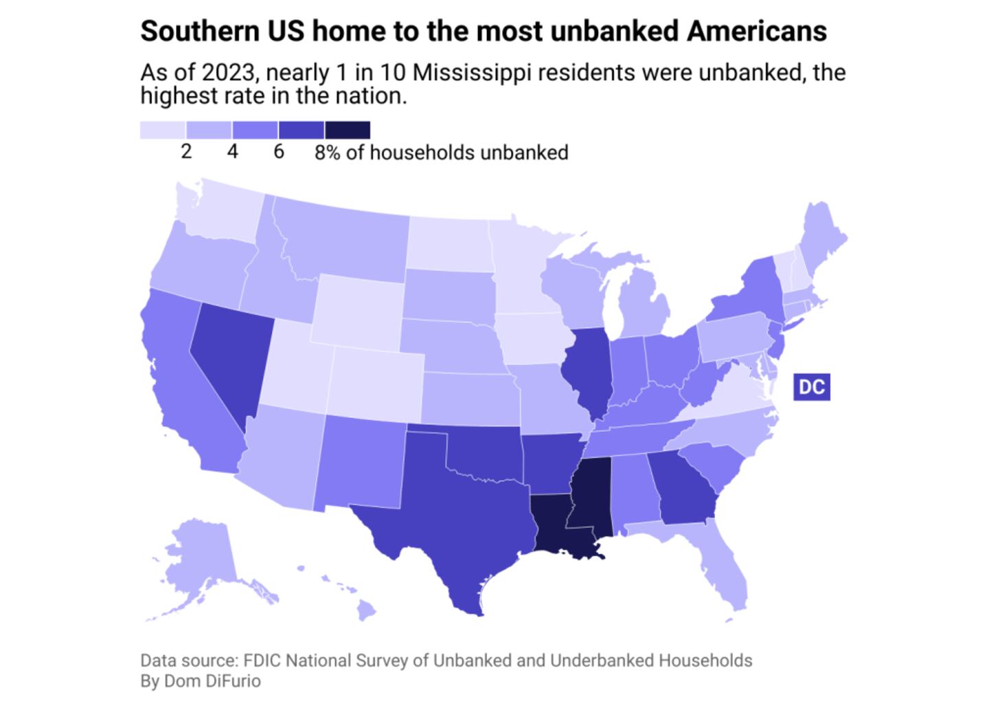 States with the largest populations of unbanked individuals are also states with significant Black populations that have historically been intentionally excluded from participating in the banking system by racist policies and practices.