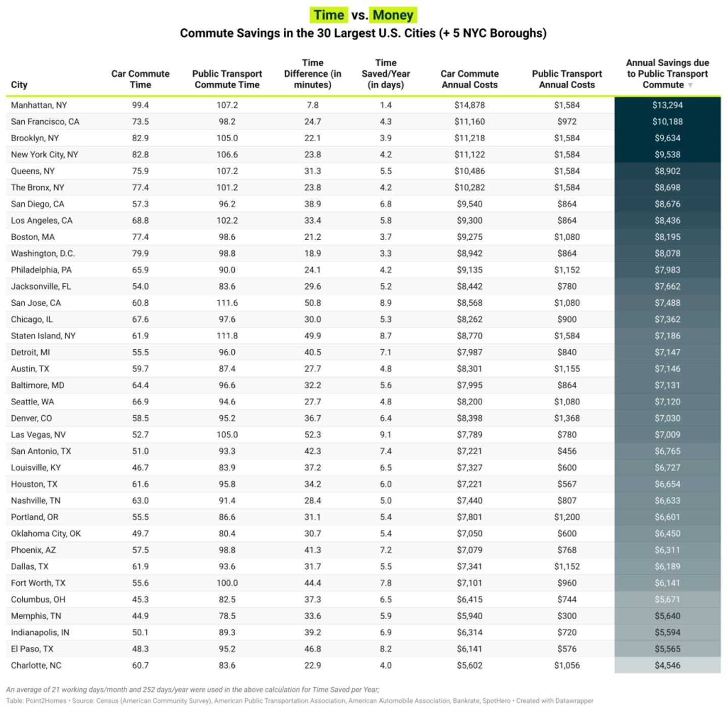 So, Point2Homes asks how much money can commuters, and especially renters, save by switching from a car commute to using public transportation in the 30 largest U.S. cities? And conversely, how much time could they save if they went for the car, instead of the bus?