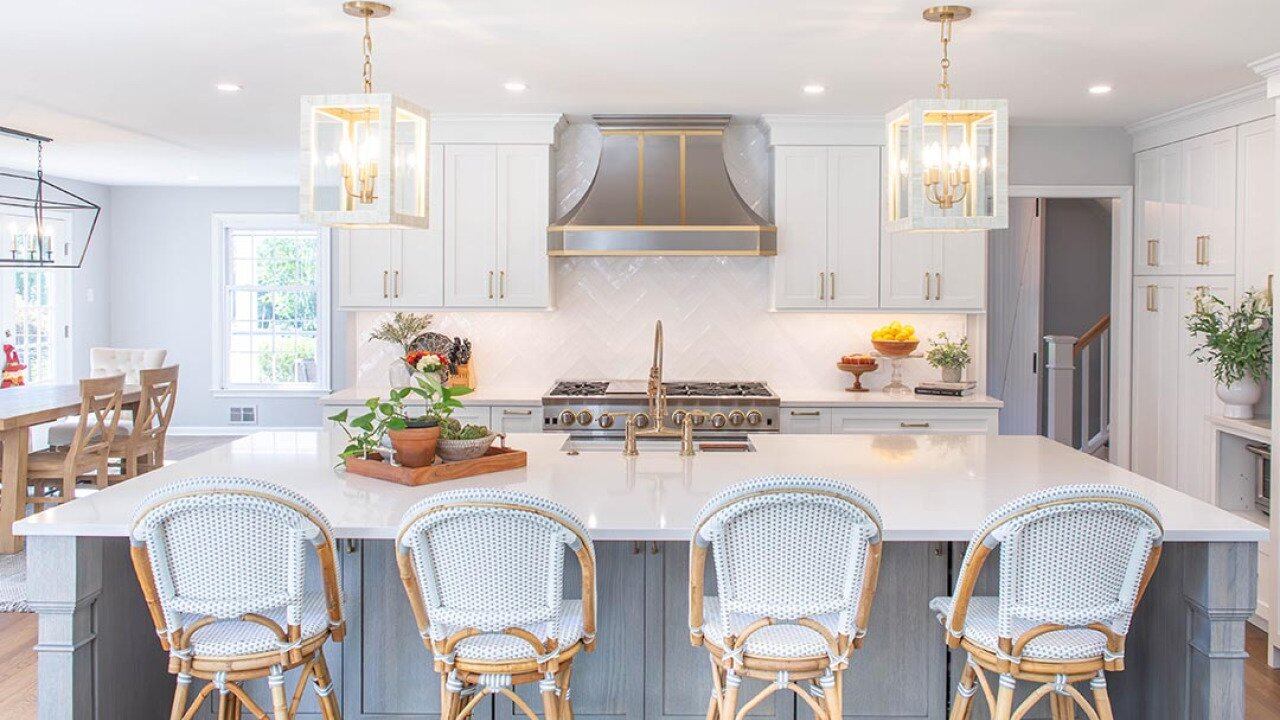 Serena & Lily lighting fixtures and stools were selected to create a warm, inviting ambiance. The lighting fixtures provide ample illumination while adding an element of style, and the stools offer comfortable seating options that complement the kitchen's design.