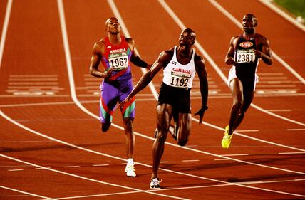 Donovan Bailey of Canada #1197 defeats Frankie Fredericks of Namibia 27 Jul 1996: Donovan Bailey of Canada #1197 defeats Frankie Fredericks of Namibia #1962 and Dennis Mitchell of the USA for the gold medal in th 100m final at the Olympic Stadium at the 1996 Centennial Olympic Games in Atlanta, Georgia. \ Mandatory Credit: Michael Cooper /Allsport (Michael Cooper/Getty Images)