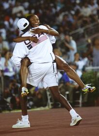 Gail Devers of the USA celebrates with her coach Bob Kersee after winning the 100m final 27 Jul 1996: Gail Devers of the USA celebrates with her coach Bob Kersee after winning the 100m final at the Olympic Stadium at the 1996 Centennial Olympic Games in Atlanta, Georgia. \ Mandatory Credit: Koji Aoki /Allsport (Koji Aoki/ AFLO/Getty Images)