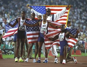 Oly M 4 X 400 3 Aug 1996: The USA 4 X 400 relay teams celebrate their gold medals at the Olympic Stadium at the 1996 Centennial Olympic Games in Atlanta, Georgia. (Mike Hewitt/Getty Images)