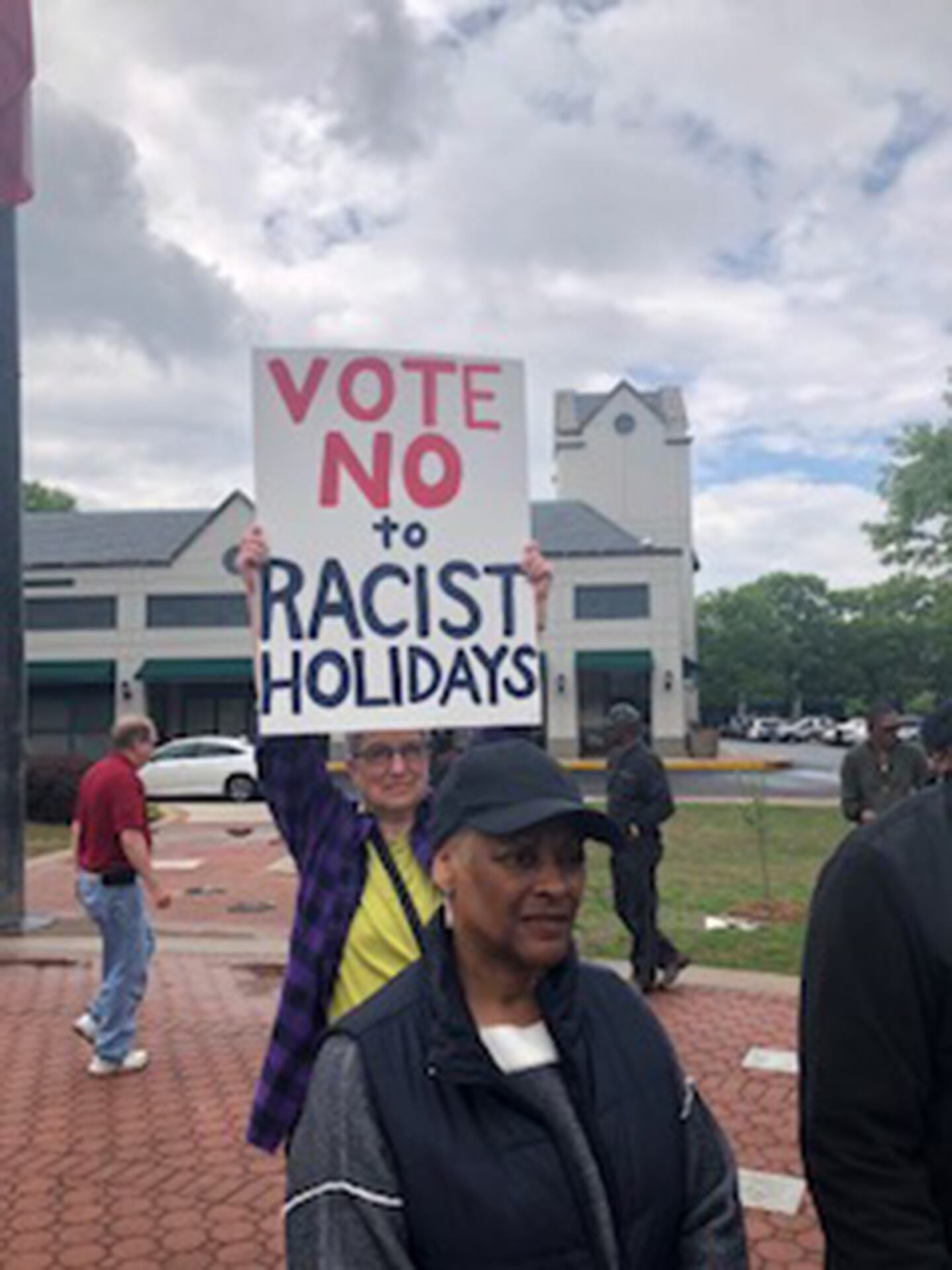 Michelle Allison who is white holds a sign that says, “Vote NO to Racist Holidays.” She tells WSB, “I find it appalling that any town government would try and support such a hateful out of date ignorant proposal.”