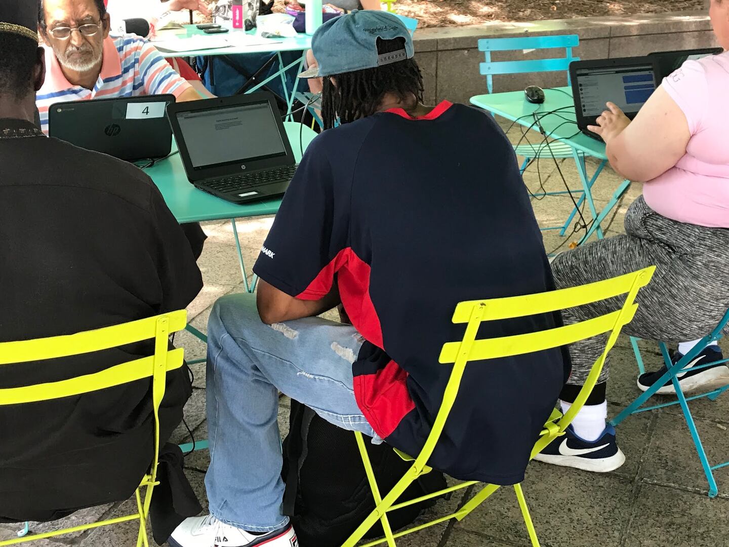 "Library on the Lawn" is in its second week at Woodruff Park. It consists of 10 Chromebooks, set up on tables under a tent on the shady north side of the park, with the water wall cascading nearby.