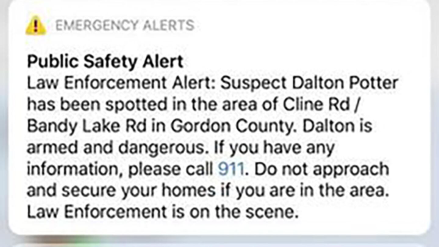 A Channel 2 Action News viewer shared a photo of an emergency alert sent to his phone on Wednesday night, alerting people that deputies were searching northern Gordon County for Potter.