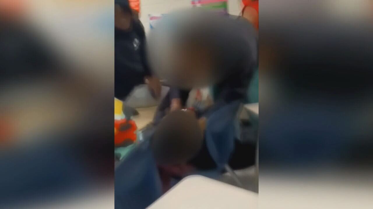 The video shows a fight about to break out between a few students before the teacher steps in. In the video, he appears to grab the student by the neck, shove him over a chair, and continue to choke the student for at least 10 seconds.