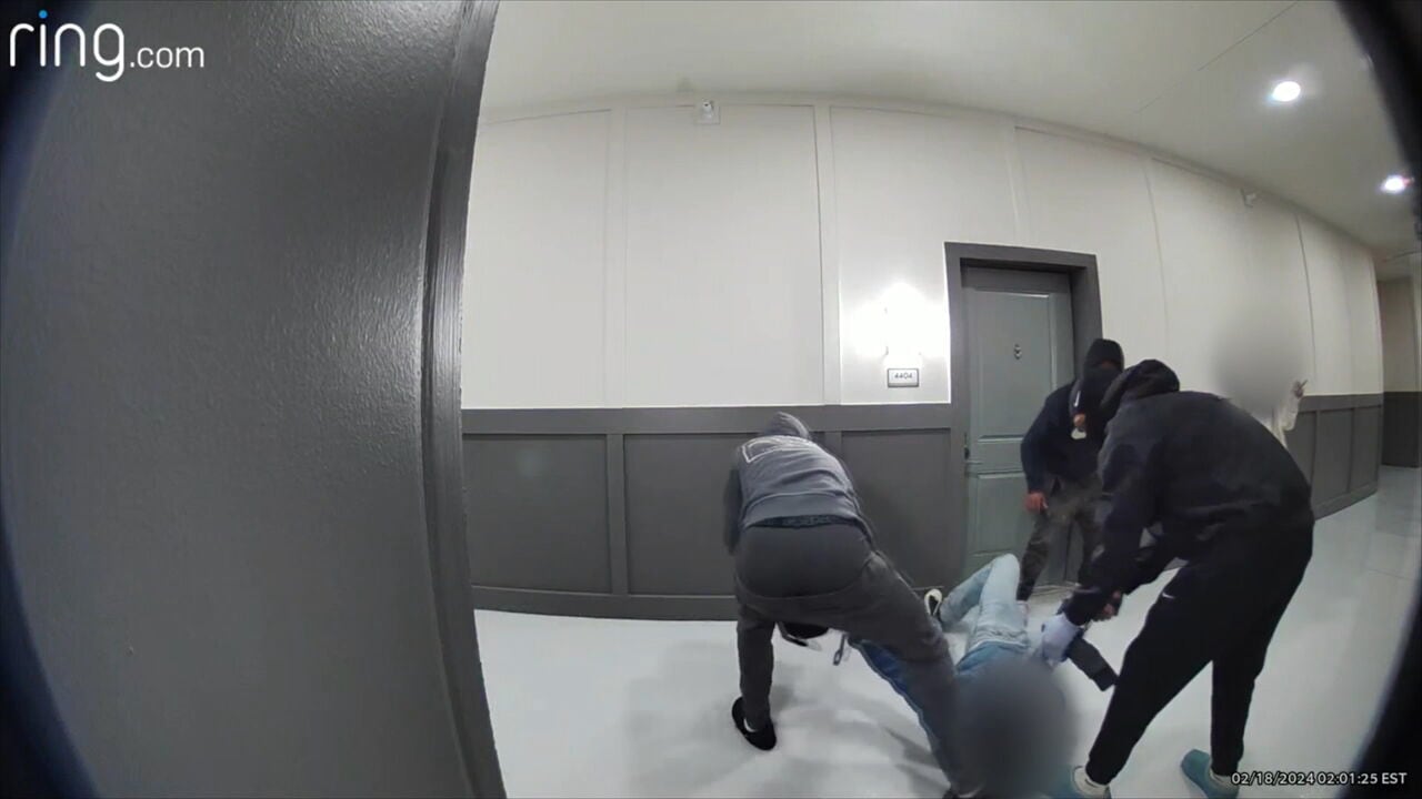 The video shows the three men confronting the couple on Feb. 18 after they came home around 2 a.m., then holding the man down on the ground and robbing him.