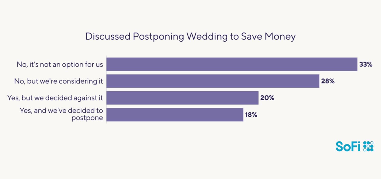 - 28% of respondents are thinking of postponing their wedding to save money, but they haven't discussed the idea with their partner.