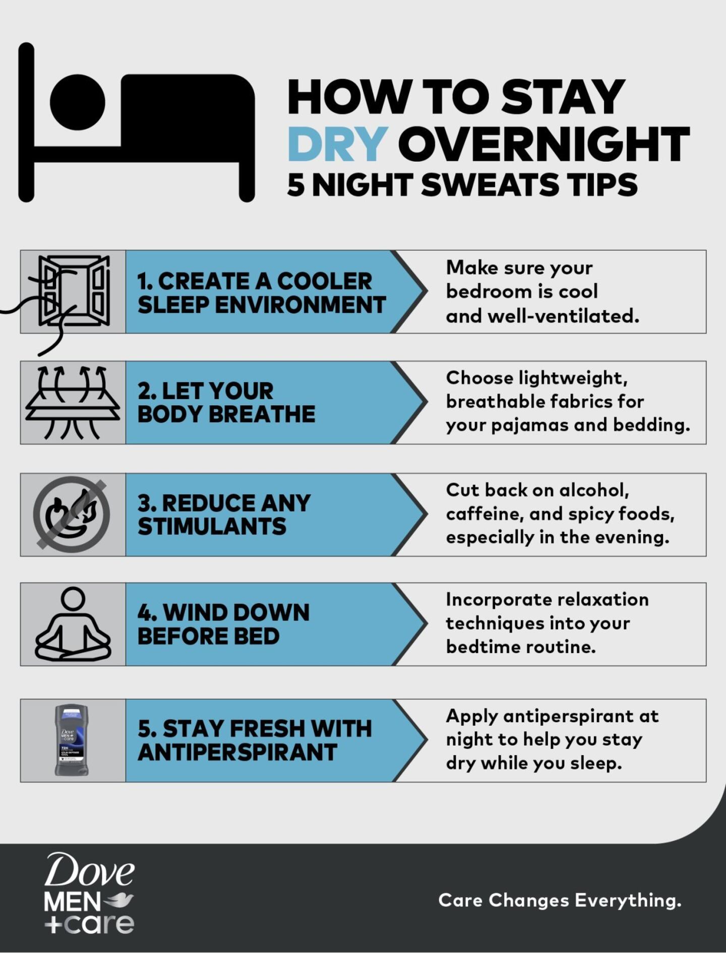 Night sweats refer to excessive sweating during sleep, which can soak your pajamas and sheets. Unlike regular sweating, which is your body's natural way of cooling down, night sweats can be triggered by various factors unrelated to temperature. At night, your body's thermoregulation works to maintain a stable internal temperature, but when this balance is disrupted, night sweats can start. Dove Men + Care has the details.