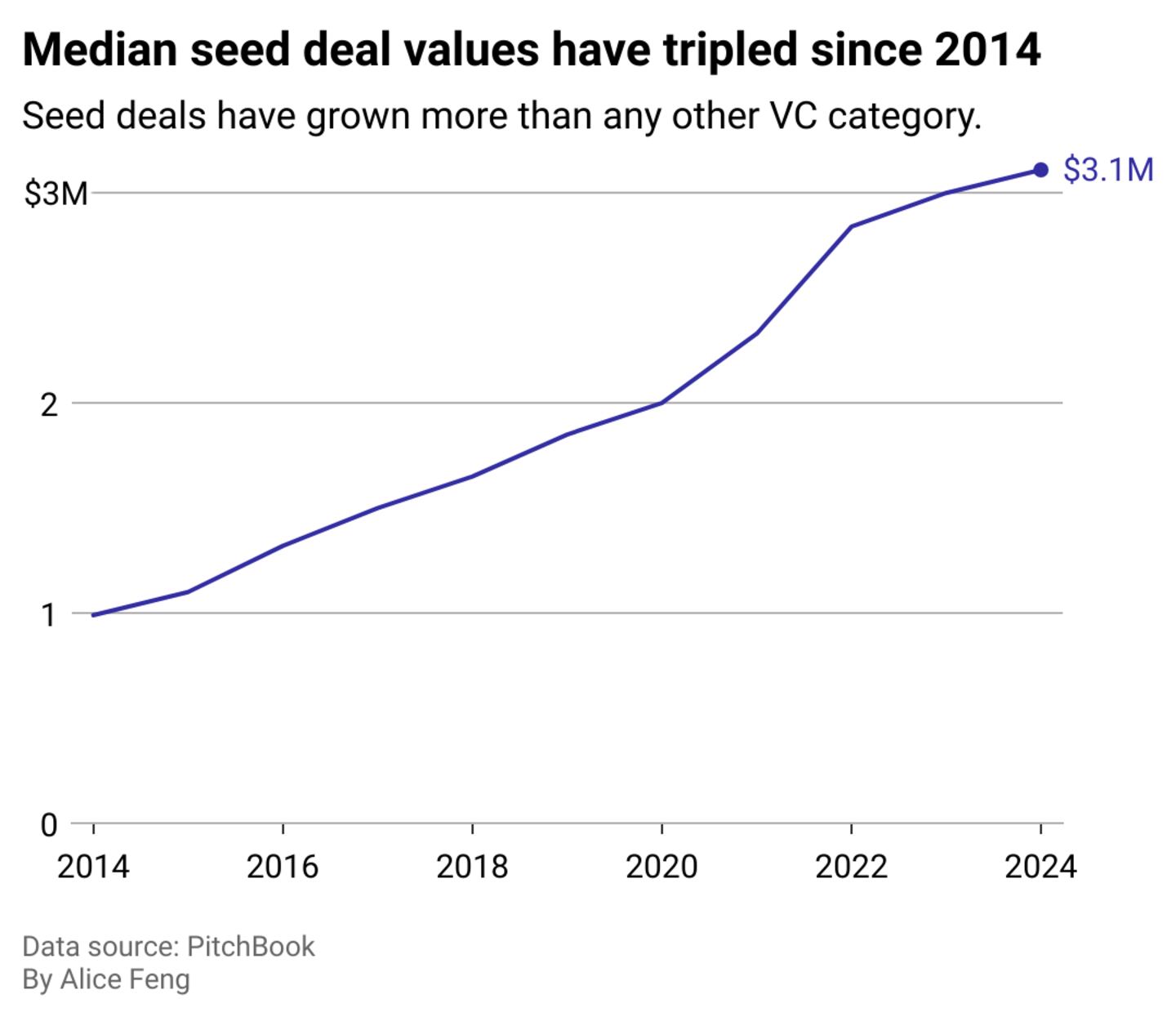 Overall, the size of seed rounds has been growing as more venture capital firms move toward investing in earlier stages. In addition to increasing deal sizes, valuations have also been rising. According to Carta, an equity management software company, the median valuation of seed-stage startups hit a record high of $14.8 million in Q3 2024. Median seed valuations ranged between $11.4 million and $12.5 million between Q3 2022 and Q1 2024 before jumping up by nearly 20% in the second half of 2024.