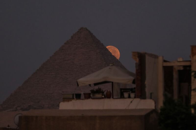 Blue Supermoon GIZA, EGYPT - AUGUST 31: A view of Super Moon known as 'Blue Moon' behind the Pyramids of Giza in Egypt on August 31, 2023. (Photo by Mohamed Elshahed/Anadolu Agency via Getty Images) (Anadolu Agency/Anadolu Agency via Getty Images)