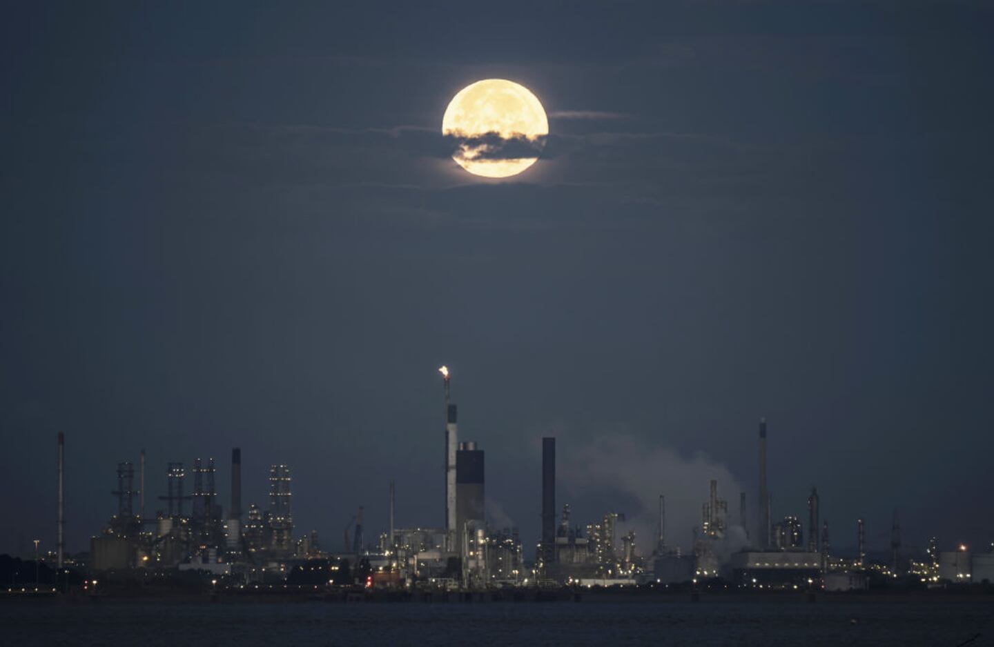 Blue Supermoon The super blue moon sets behind the Humber Refinery in South Killingholme. The blue moon refers to the second full moon in one calendar month, which occurs approximately once every two or three years. This one is also supermoon - when the Earth's natural satellite will appear about 14% bigger and 30% brighter in the sky as it reaches its closest point to Earth. Picture date: Thursday August 31, 2023. (Photo by Danny Lawson/PA Images via Getty Images) (Danny Lawson - PA Images/PA Images via Getty Images)