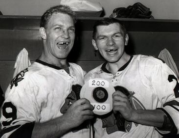 Through the years A grinning Bobby Hull, forward for the Chicago Blackhawks, holds up a puck in the locker room following a game against the New York Rangers at Madison Square Garden. The puck Hull is holding is the one he launched past Ranger goalie Lorne Worsley, making Hull only the third person in the history of the NHL to score 50 goals in a season. (Bettmann)