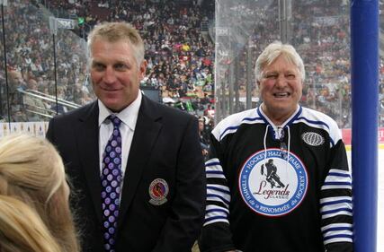 Through the years TORONTO, ON - NOVEMBER 08: Brett Hull (L) and Bobby Hull (R) man the bench at the Hockey Hall of Fame Legends Game at the Air Canada Centre on November 8, 2009 in Toronto, Canada. (Photo by Bruce Bennett/Getty Images) (Bruce Bennett/Getty Images)