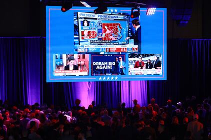 Trump wins 2024 election LAS VEGAS, NEVADA - NOVEMBER 05: Guests react at the Nevada Democratic Party's election results watch party after Pennsylvania was called for Donald Trump at Aria Resort & Casino on November 05, 2024 in Las Vegas, Nevada. Today, voters cast their ballots to determine whether Democratic presidential nominee and U.S. Vice President Kamala Harris or Republican presidential nominee and former U.S. President Donald Trump will become the next President of the United States as well as multiple state elections that will determine the balance of power in Congress. (Photo by Ethan Miller/Getty Images) (Ethan Miller/Getty Images)