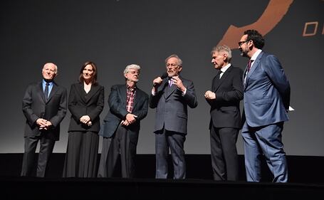 U.S. Premiere of Indiana Jones and the Dial of Destiny LOS ANGELES, CALIFORNIA - JUNE 14: (L-R) Frank Marshall, Kathleen Kennedy, President, Lucasfilm, George Lucas, Steven Spielberg, James Mangold and Harrison Ford speak onstage at the Indiana Jones and the Dial of Destiny U.S. Premiere at the Dolby Theatre in Hollywood, California on June 14, 2023. (Photo by Alberto E. Rodriguez/Getty Images for Disney) (Alberto E. Rodriguez/Getty Images for Disney)